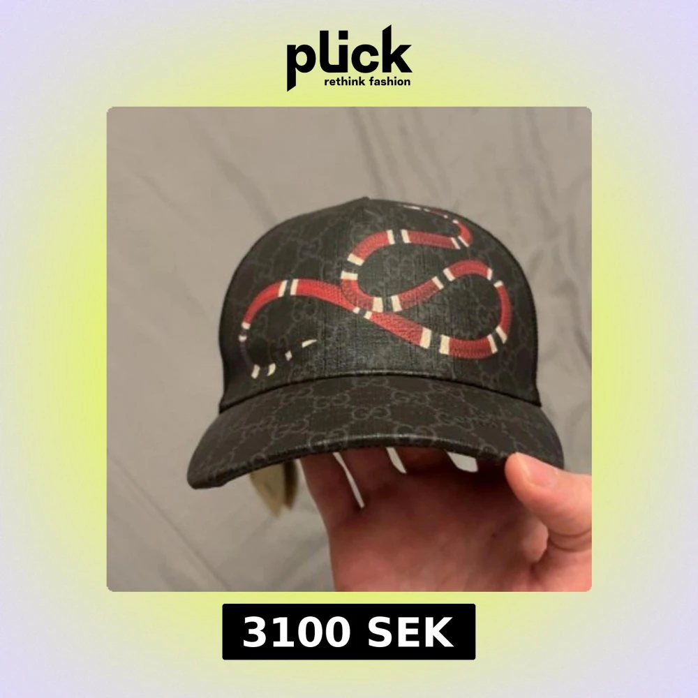 Snygg svart keps från Gucci med klassiskt GG-mönster och en fet röd och vit orm på framsidan. Baksidan har mesh och justerbart band med röd och blå detalj. Perfekt för dig som vill sticka ut med designer vibes.