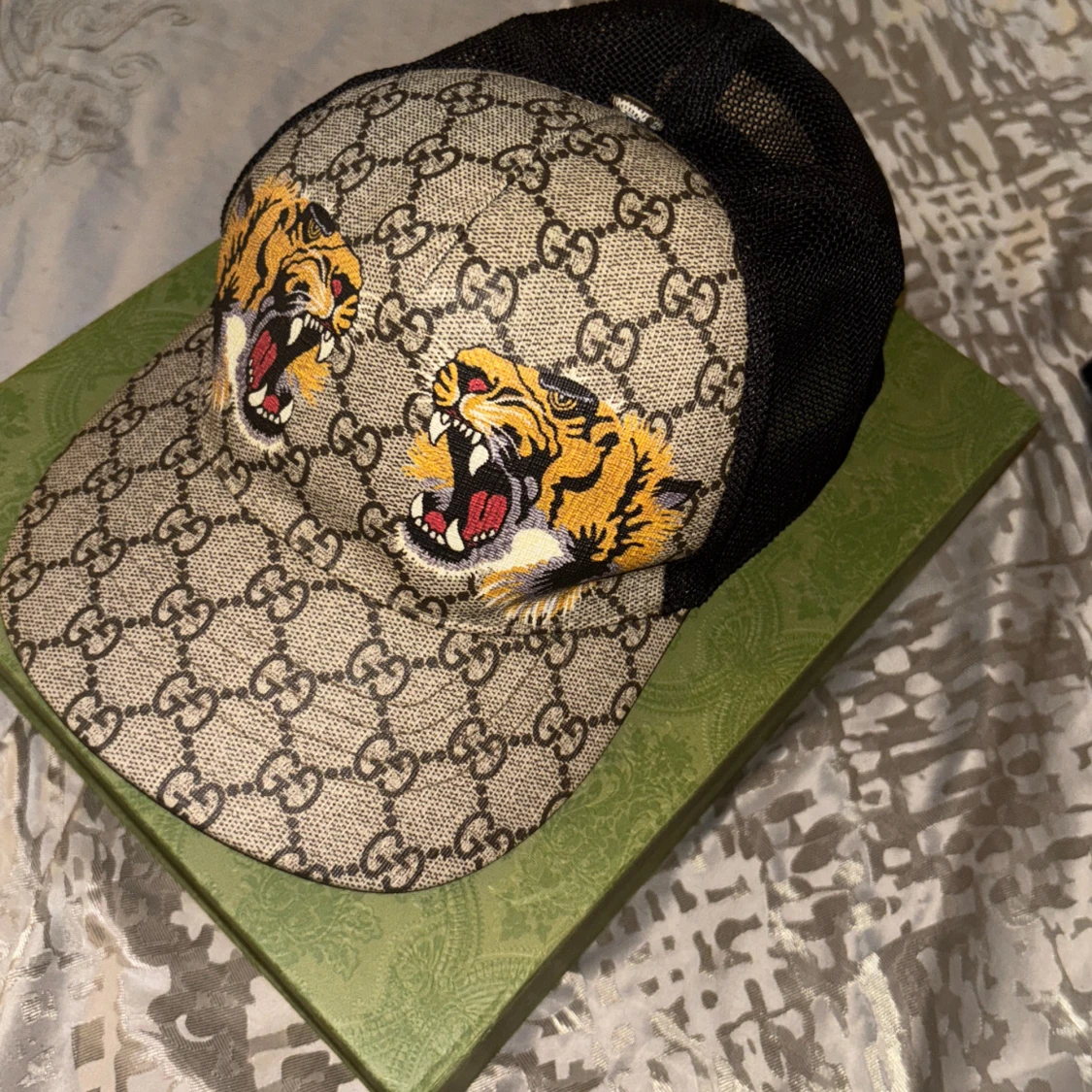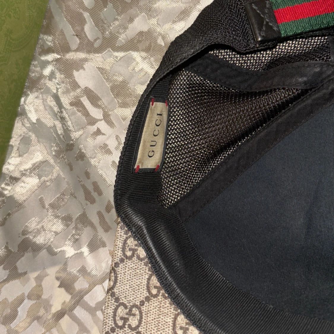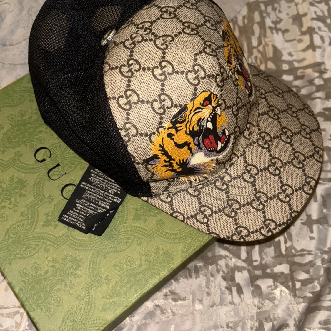 Snygg keps från Gucci med klassiskt GG-monogram i beige och brunt, prydd med två broderade tigrar framtill. Baksidan är i svart mesh för extra ventilation och insidan har den ikoniska gröna och röda Gucci-randen. Perfekt för dig som vill sticka ut med lyxig streetstyle.