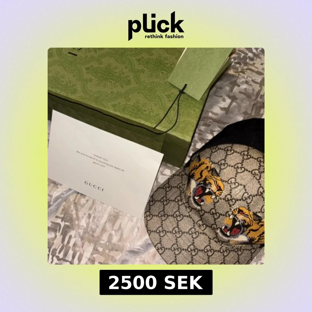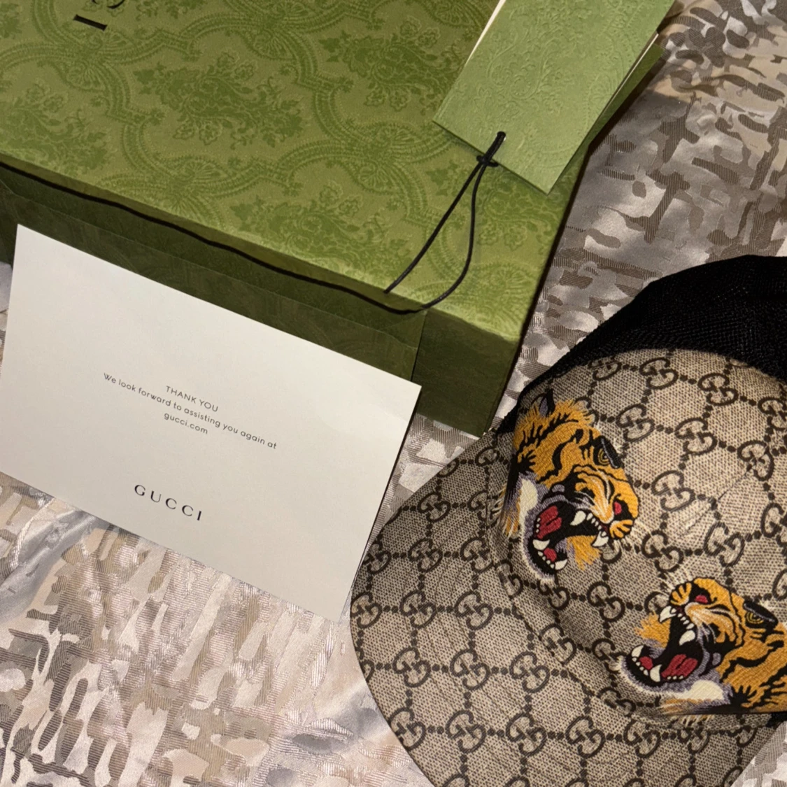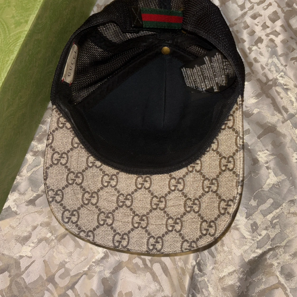 Snygg keps från Gucci med klassiskt GG-monogram i beige och brunt, prydd med två broderade tigrar framtill. Baksidan är i svart mesh för extra ventilation och insidan har den ikoniska gröna och röda Gucci-randen. Perfekt för dig som vill sticka ut med lyxig streetstyle.