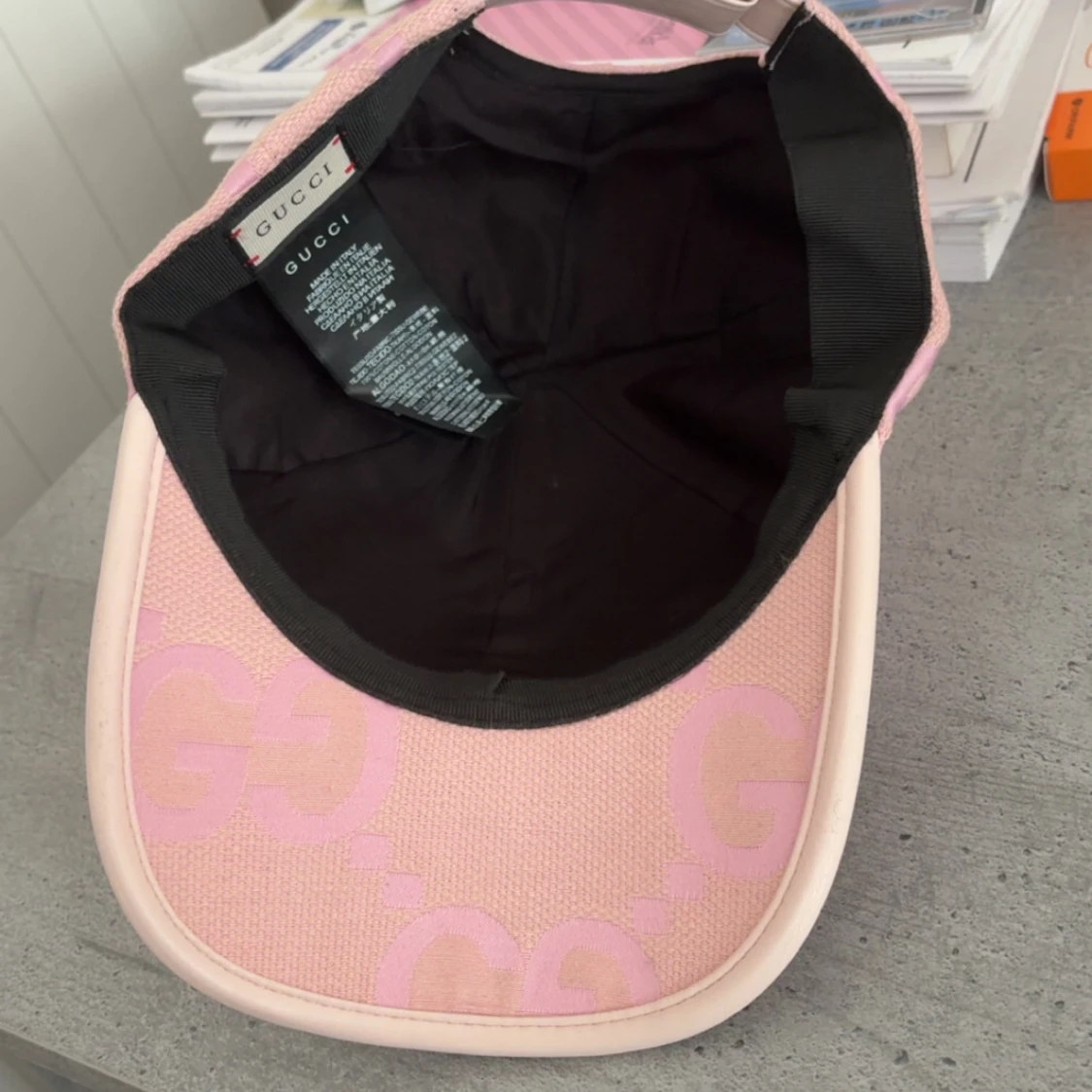 Säljer en snygg rosa keps från Gucci med ikoniskt GG-mönster i ljusrosa. Kepsen har böjd skärm, justerbart spänne bak och är tillverkad i ett tåligt bomullsmaterial. Perfekt accessoar för att lyfta din outfit med en lyxig touch.