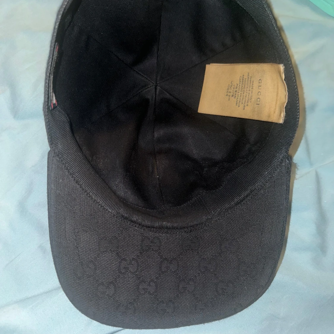 Unik Snygg svart keps från Gucci med klassiskt GG-mönster över hela kepsen och en rund patch framtill med guldig GUCCI-text. Kepsen är tillverkad i bomull och har en stilren, böjd skärm. Perfekt för dig som vill ha en exklusiv streetstyle-look,