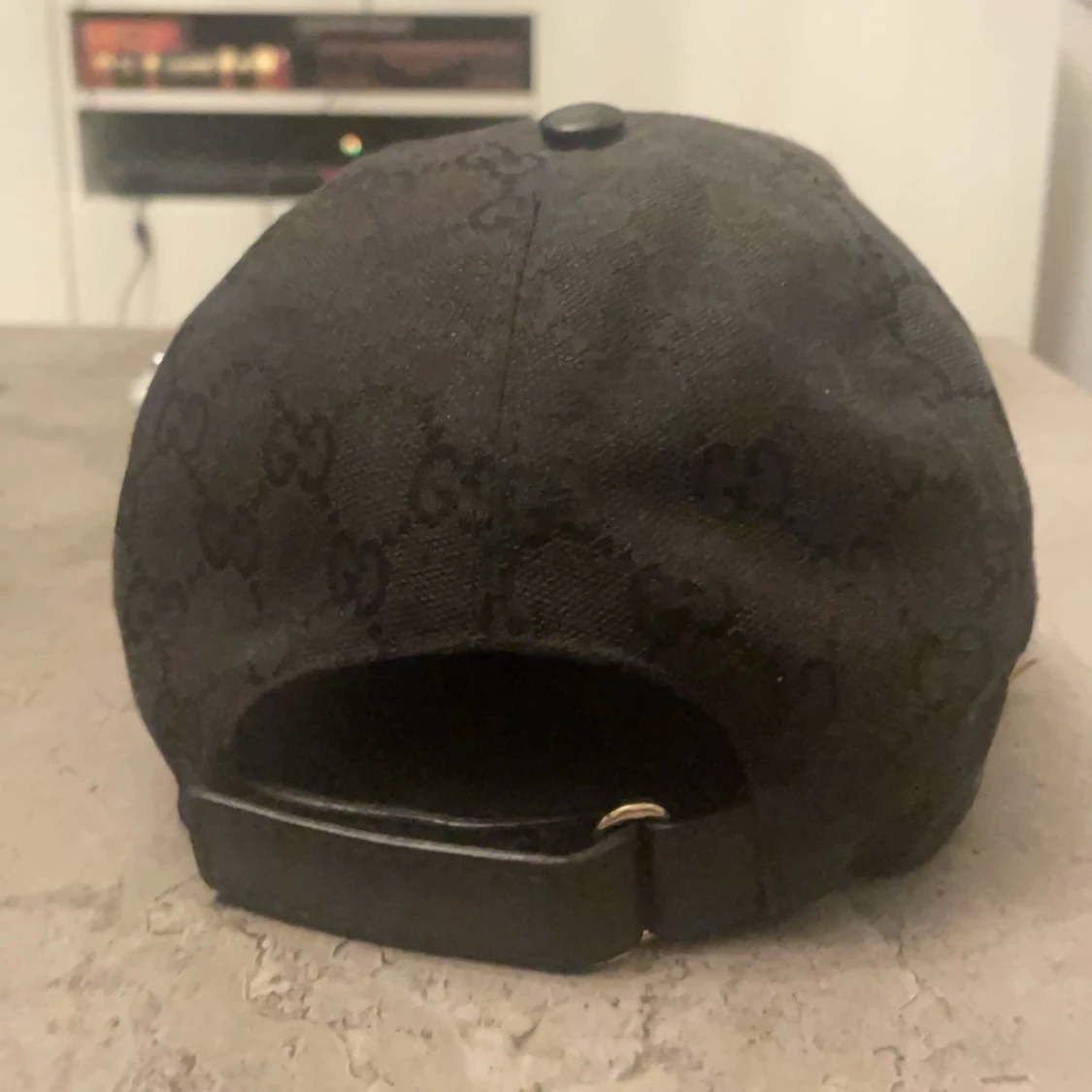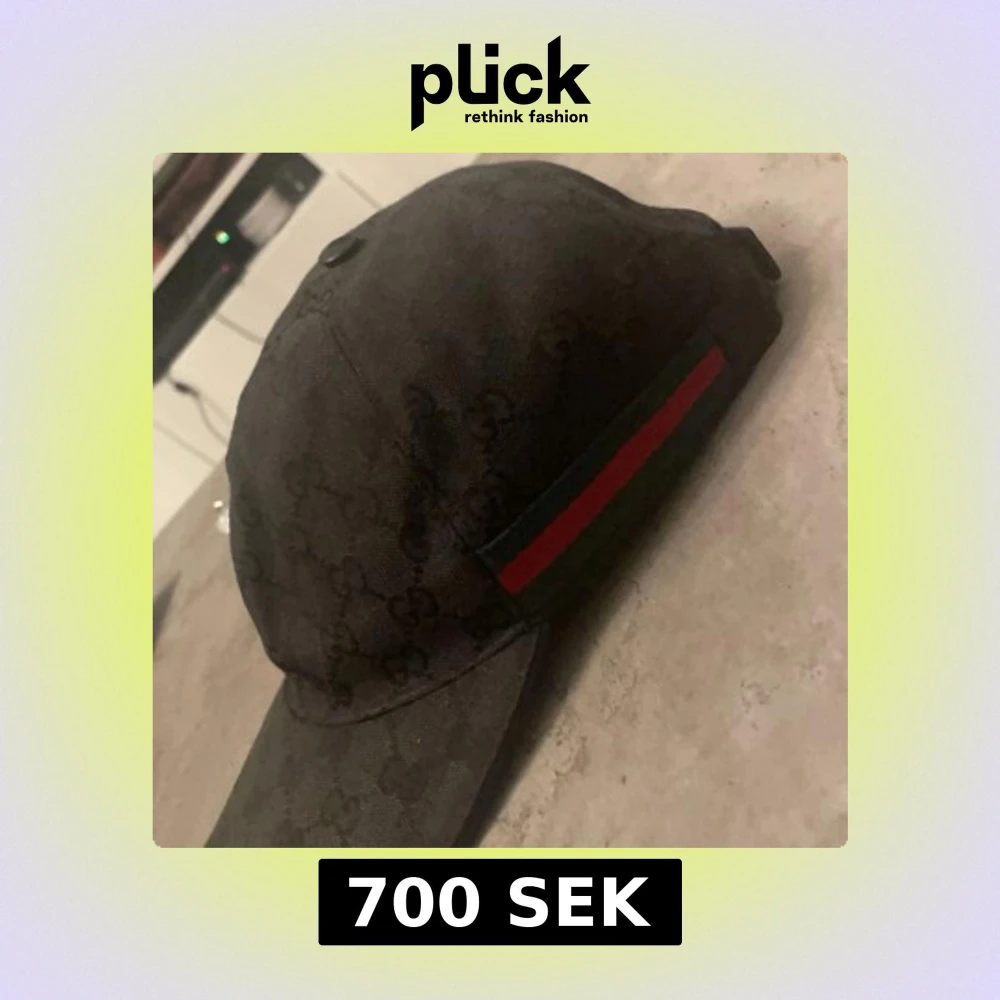 Snygg svart keps från Gucci med diskret GG-monogram över hela tyget och klassiskt grönt och rött band på sidan. Justerbar rem baktill i skinn. ÄKTA!!!