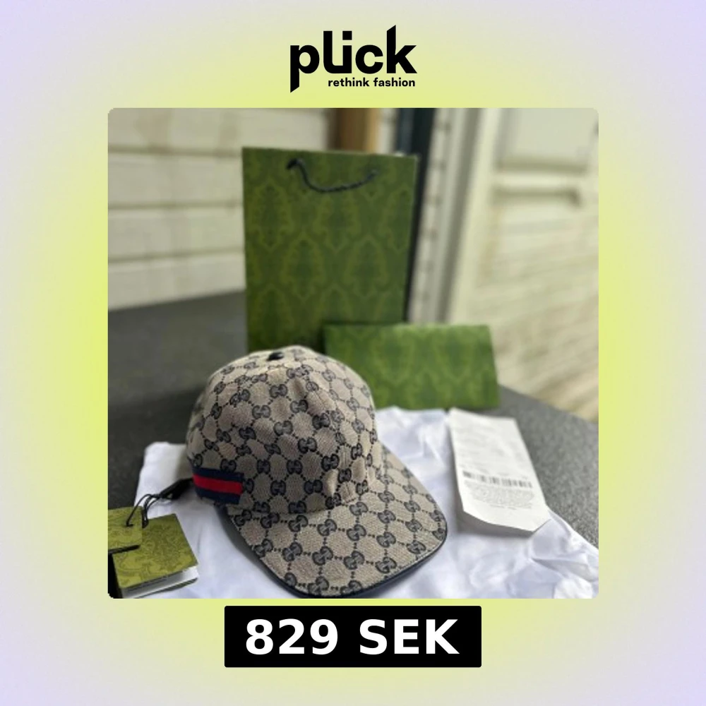 Snygg keps från Gucci i beige med klassiskt GG-monogram över hela kepsen. Har en röd och blå rand på sidan som ger extra lyxig känsla. Kepsen är tillverkad i canvasliknande material och har böjd skärm samt svart kant runt om.