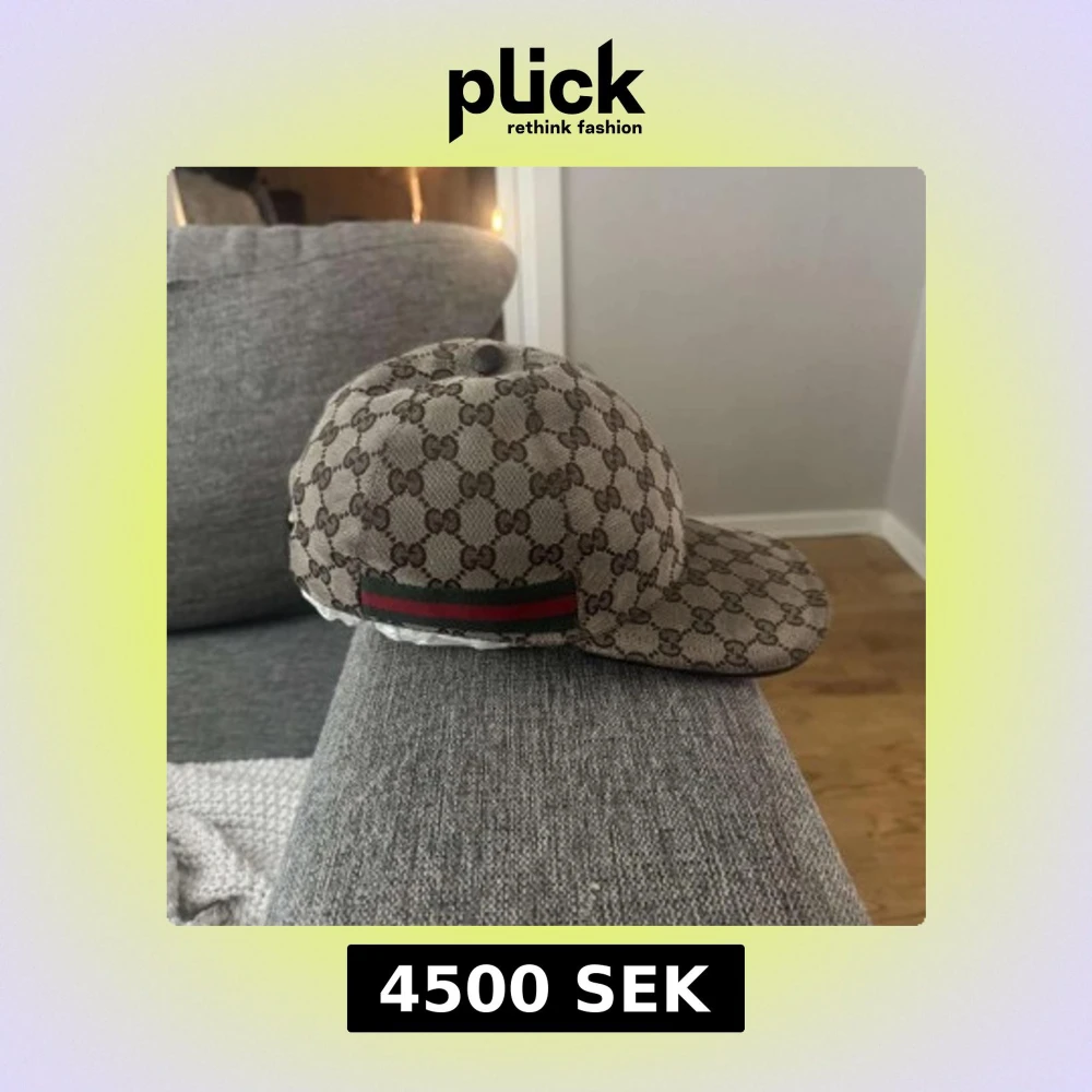 Säljer en beige keps från Gucci med klassiskt GG-monogram över hela kepsen och en grön-röd rand på sidan. Kepsen har böjd skärm och är tillverkad i ett tygmaterial med exklusiv känsla.