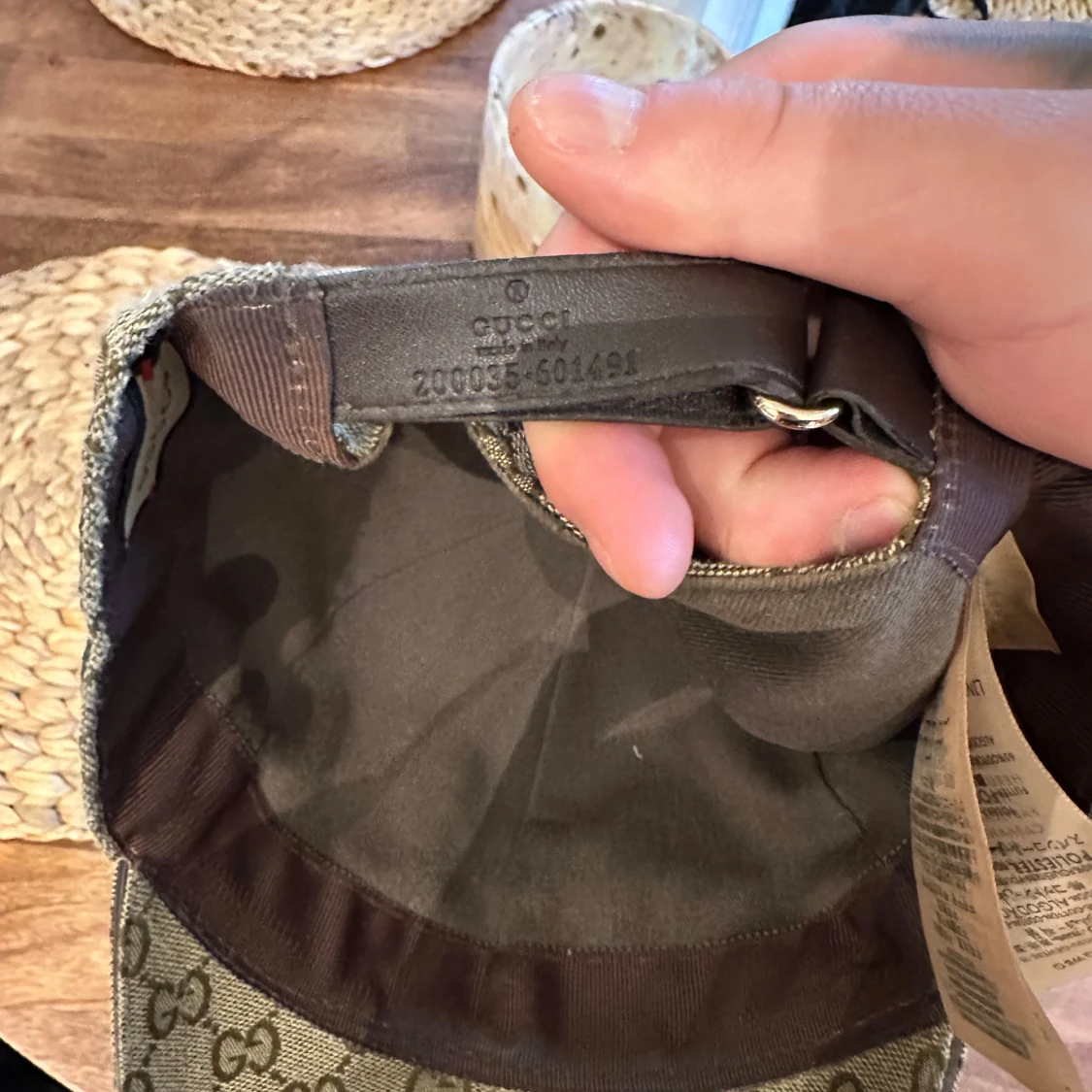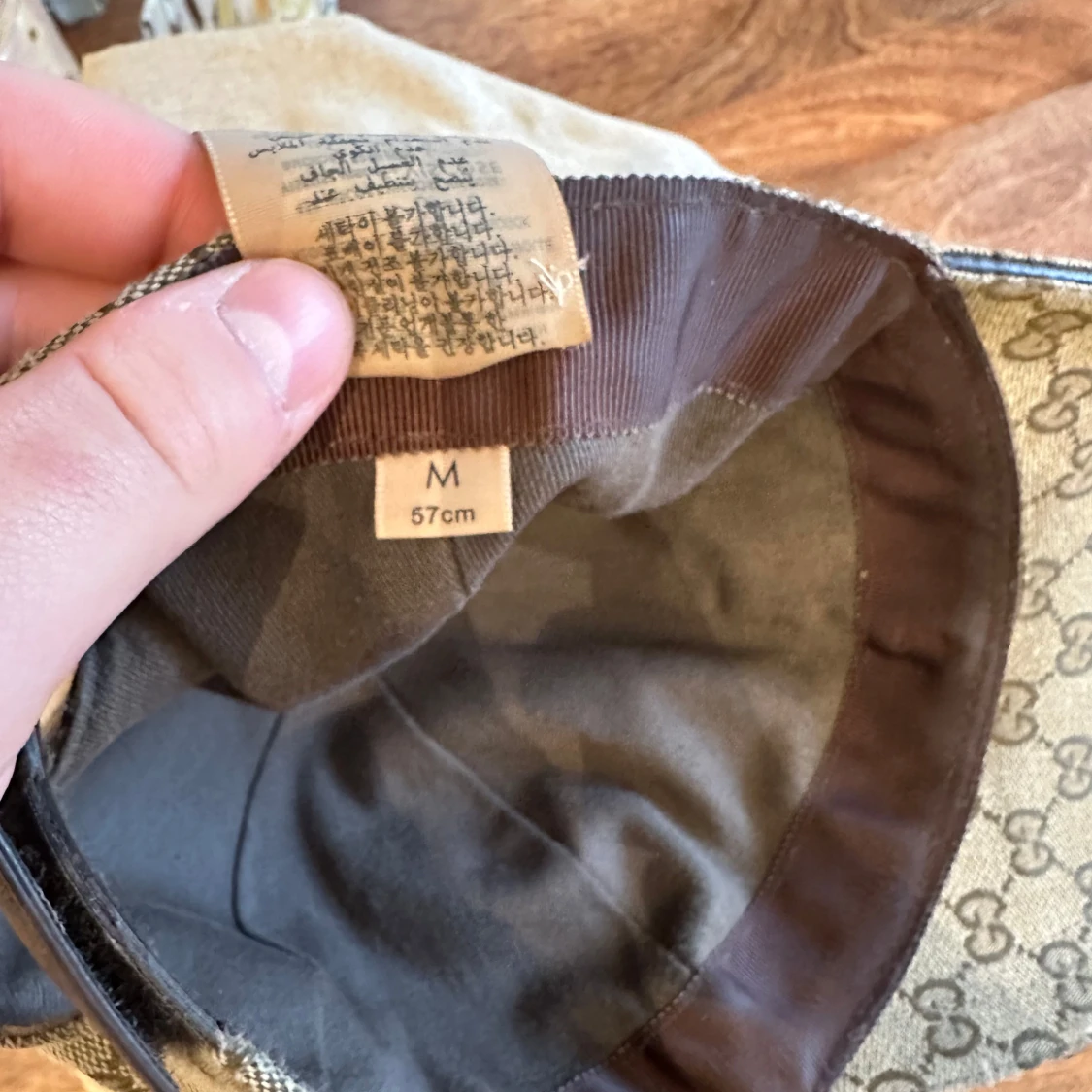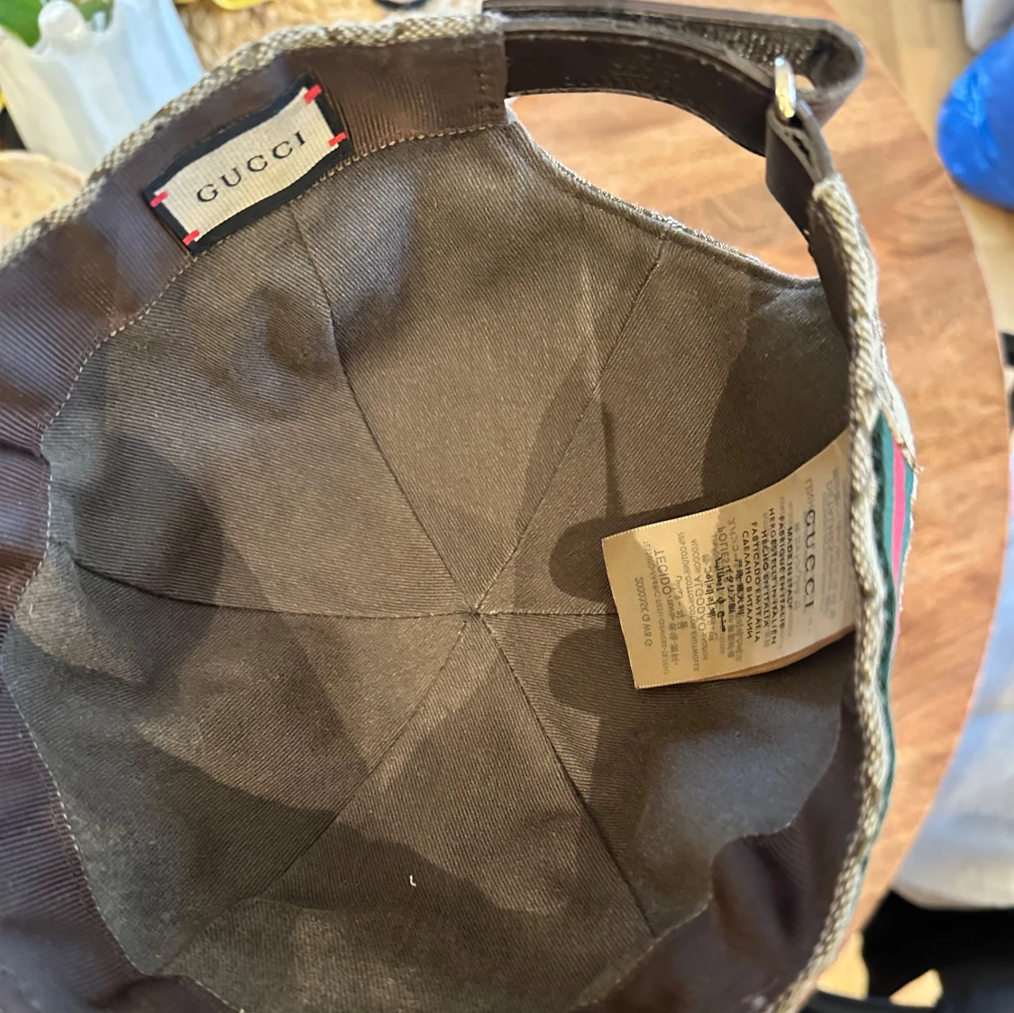 Snygg keps från Gucci i beige med klassiskt GG-monogram över hela kepsen. Äkta Storlek M box å bag finns till den.