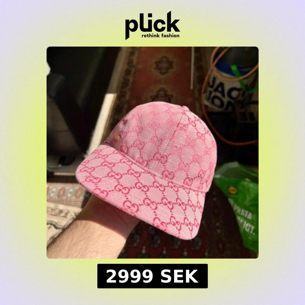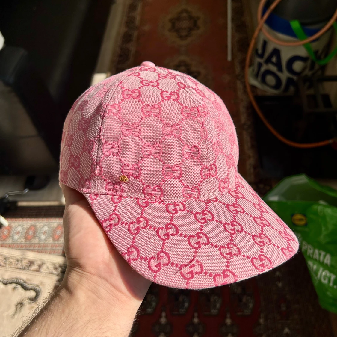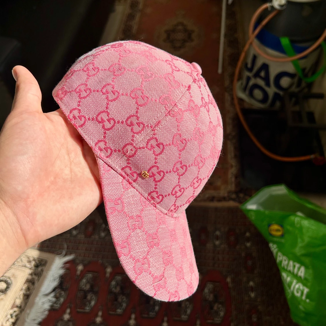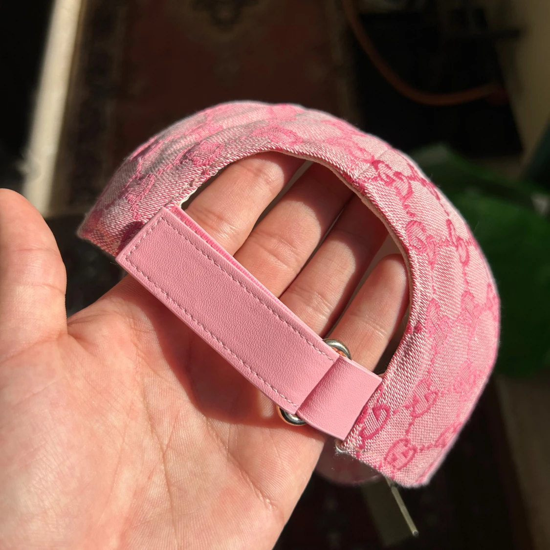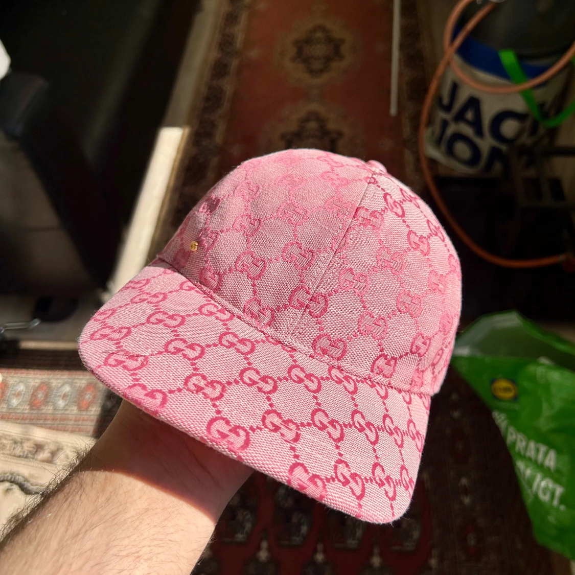 Säljer en rosa keps från Gucci i jeansmaterial med ikoniskt GG-mönster över hela kepsen. Kepsen har böjd skärm och en liten guldfärgad detalj på sidan. Perfekt för dig som vill sticka ut med en lyxig och trendig accessoar.