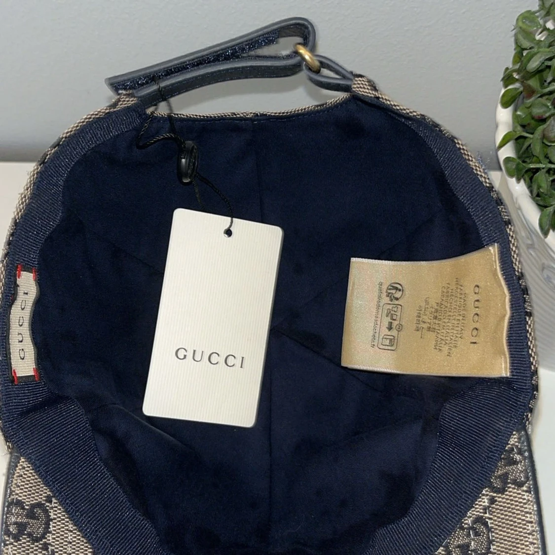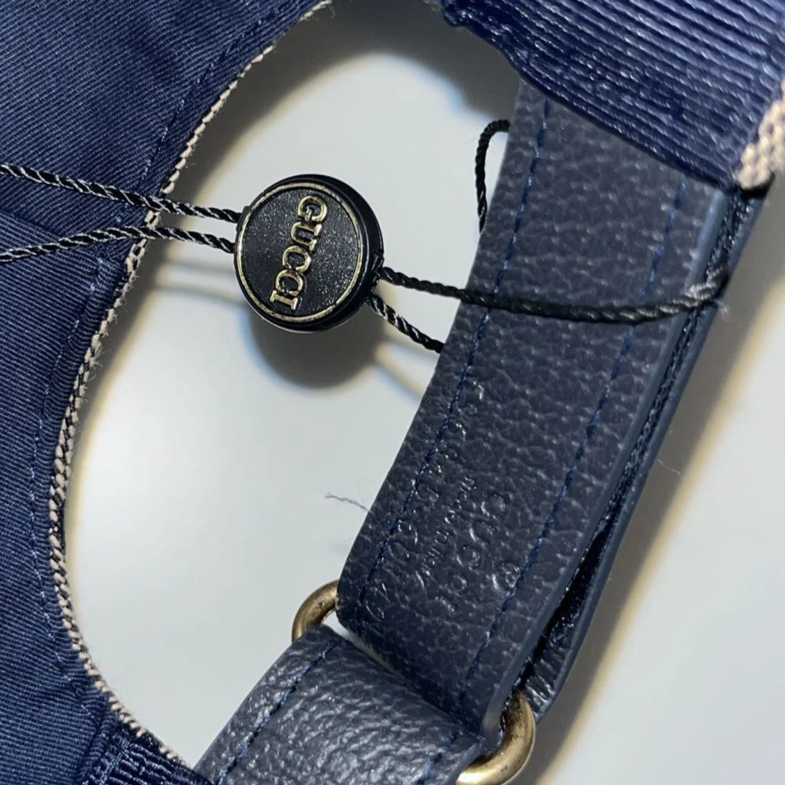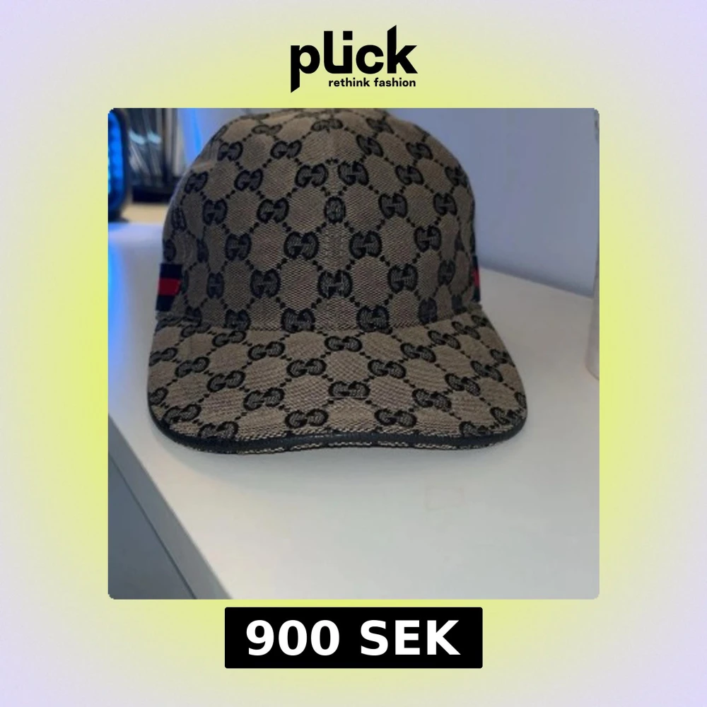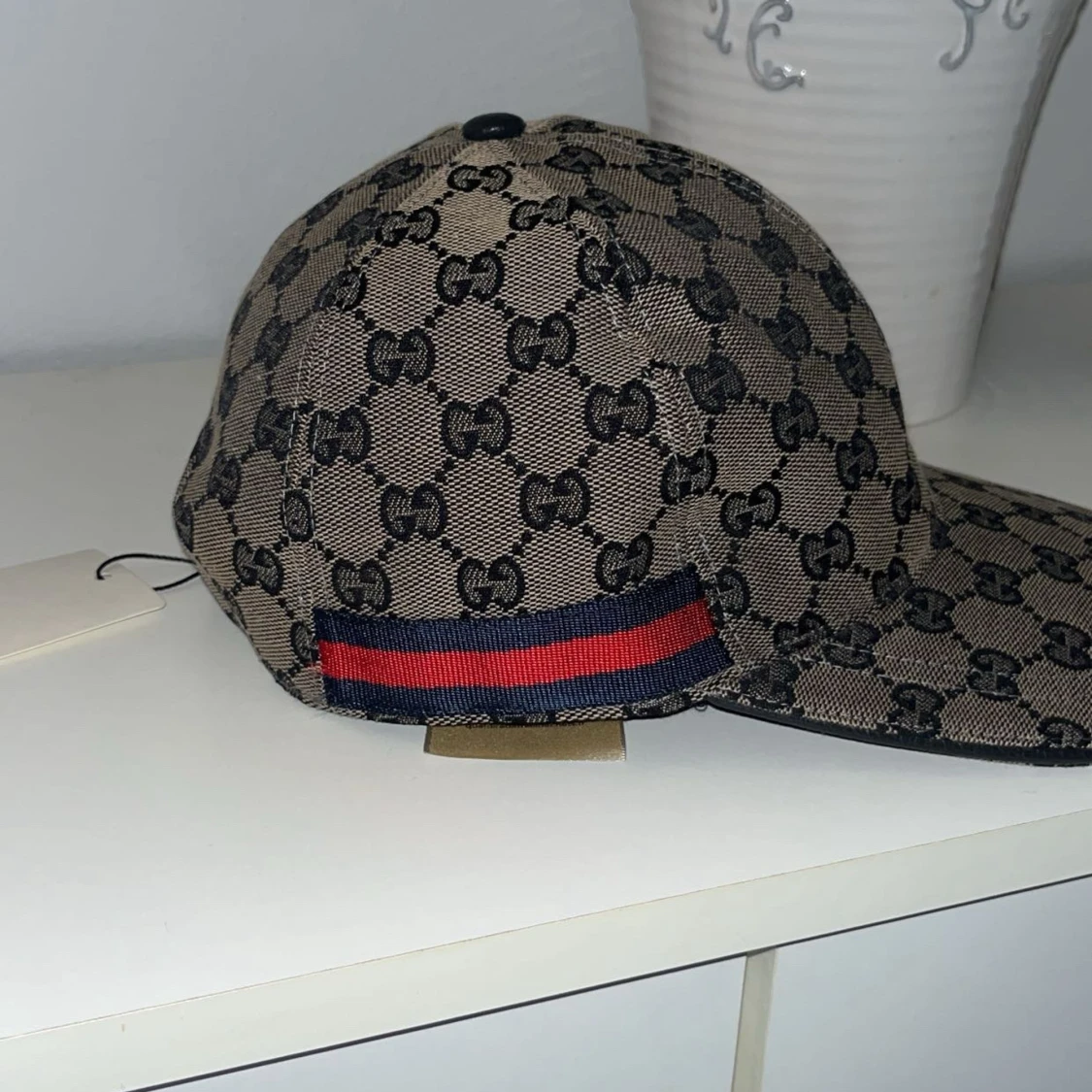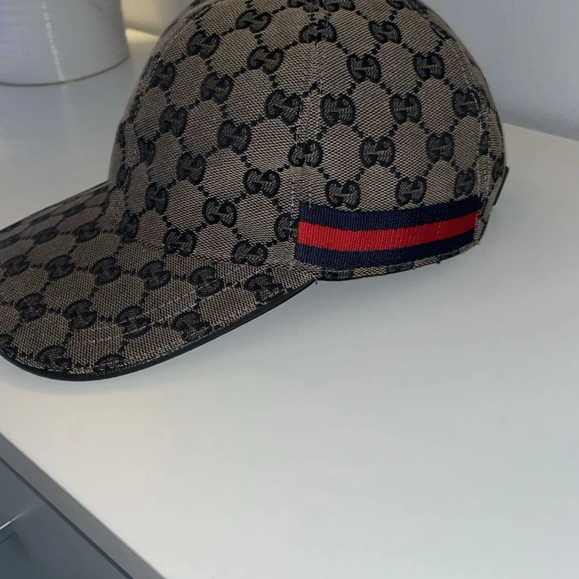 Exklusiv keps från Gucci i beige och svart med ikoniskt GG-mönster över hela kepsen. Snygg röd och marinblå rand på sidan. Justerbar rem baktill och insida i mörkblått tyg. Perfekt för dig som vill sticka ut med lyxig streetstyle. Storlek M men ändå justerbar pris 900 pris kan diskuteras