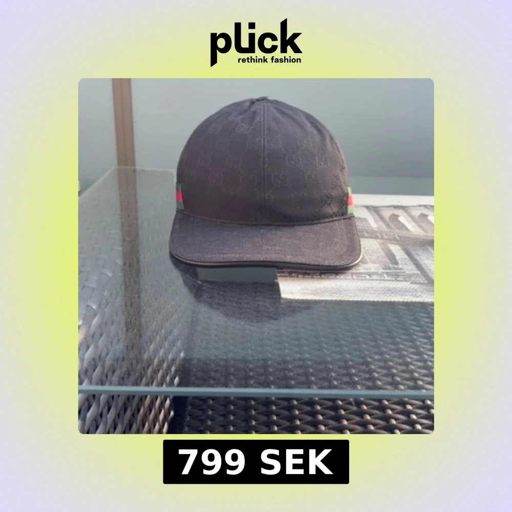 Svart keps från Gucci med diskret GG-monogram över hela tyget och klassiska gröna och röda ränder på sidan. Justerbar rem baktill i svart läder med guldfärgad spänne. Snygg och stilren accessoar.