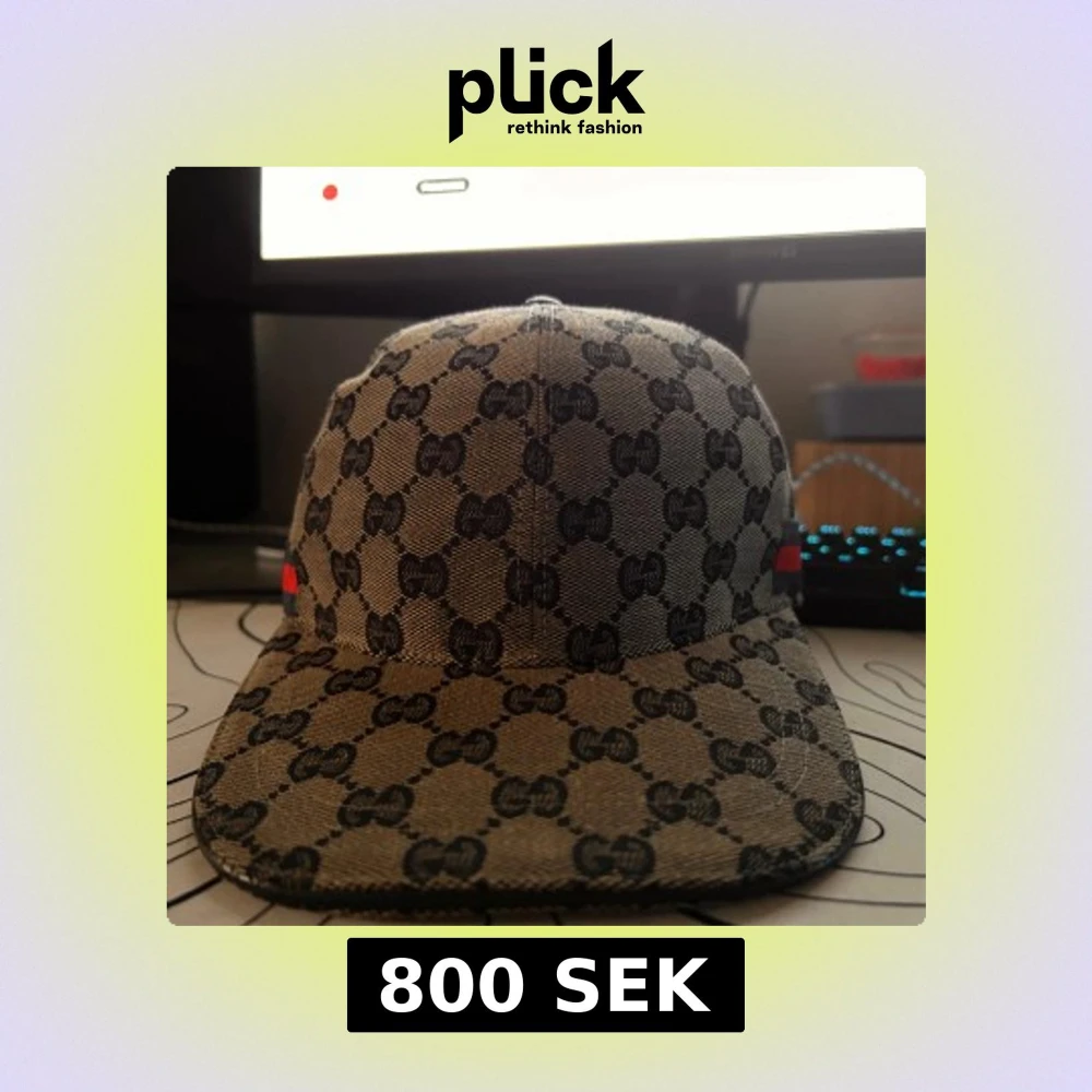 Säljer en snygg keps från Gucci med klassiskt GG-mönster i beige och svart. Kepsen har en röd och blå rand på sidan och är tillverkad i bomullsmix. Perfekt accessoar för att lyfta din stil. Pris kan sänkas vid snabb affär öppen för byten men möts upp då