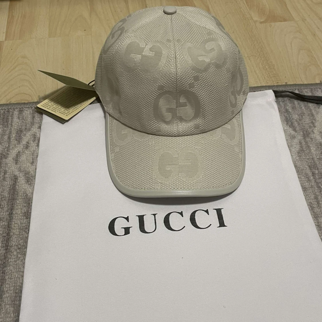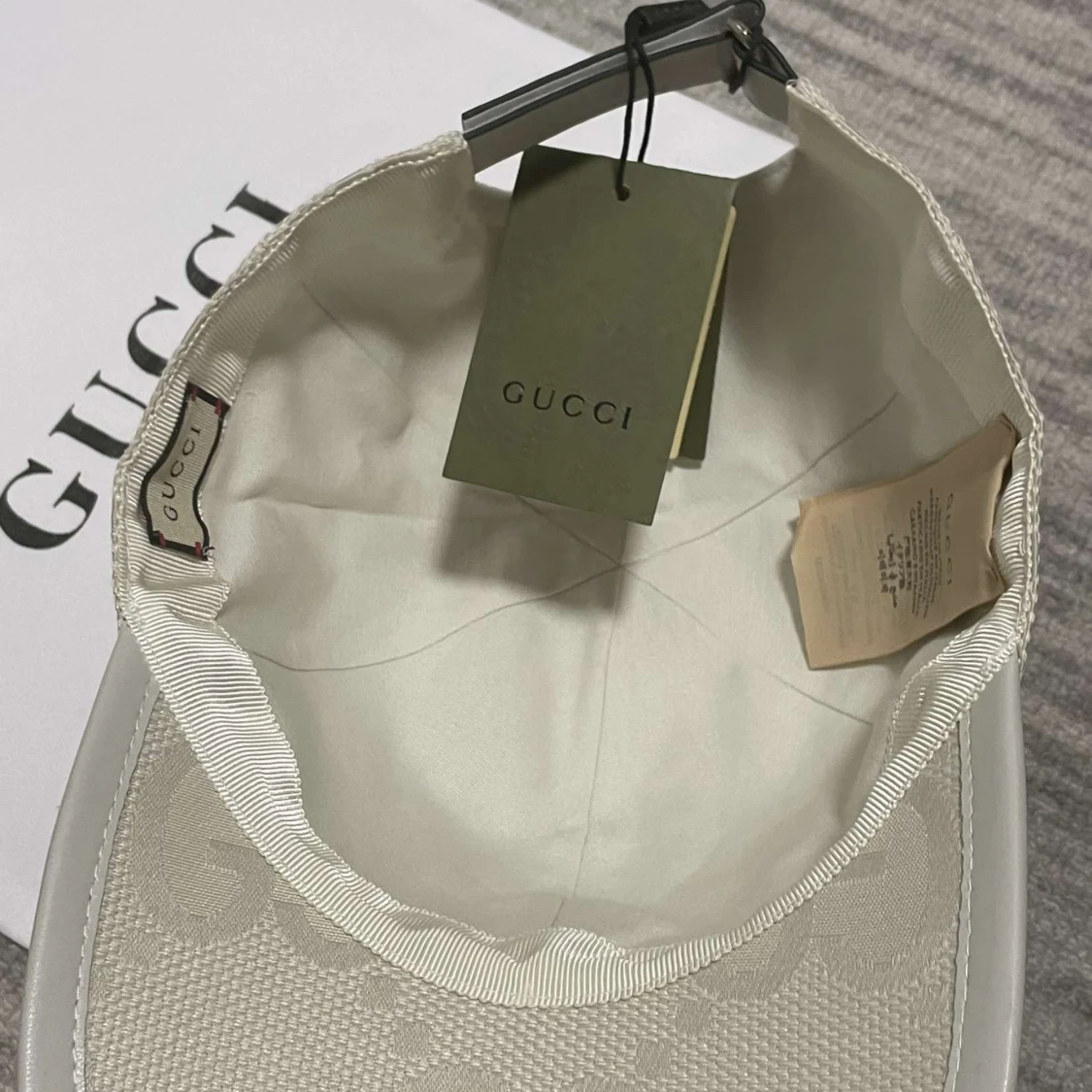 Snygg beige keps från Gucci med diskret GG-logga i mönstret. Kepsen har böjd skärm och klassisk passform. Perfekt accessoar för en stilren look.