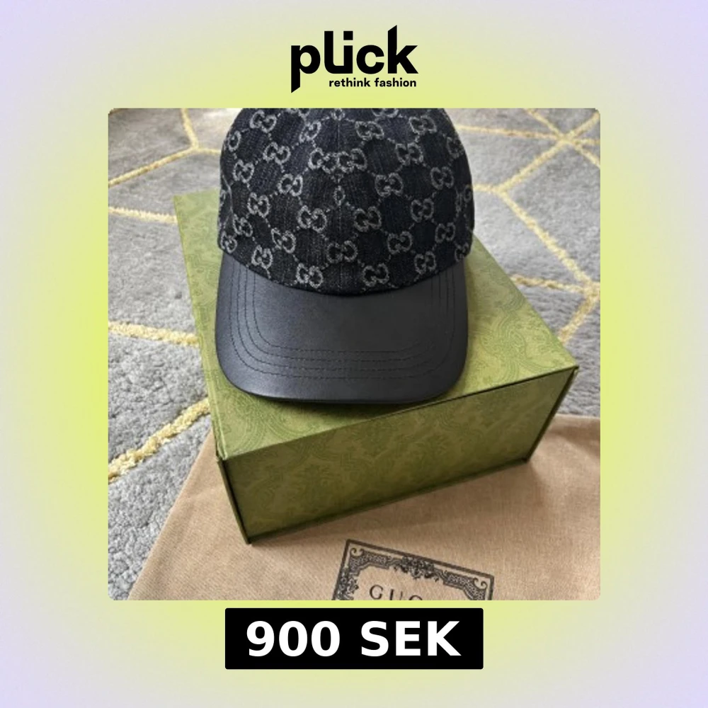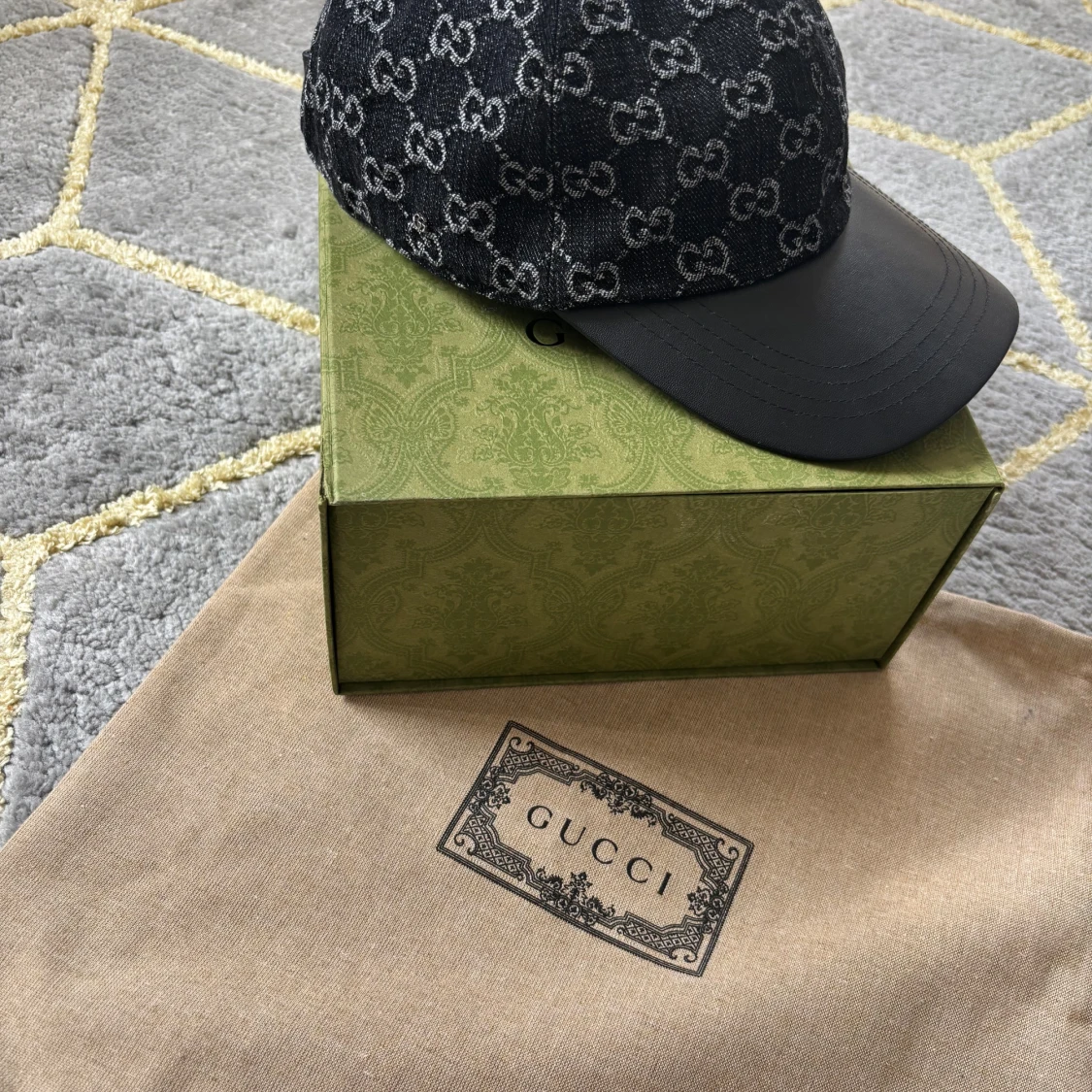 Snygg svart keps från Gucci med klassiskt GG-monogram i grått över hela ovandelen. Skärmen är i svart skinn och resten av kepsen är i jeansmaterial. Perfekt för dig som vill ha en lyxig och trendig accessoar med tydlig designerstil. Storlek M Nya modellen. Möts upp i Göteborg