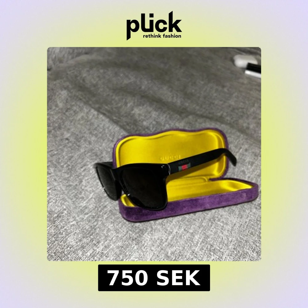 Stilrena svarta solglasögon från Gucci med rektangulära bågar och diskreta röda och gröna detaljer på sidorna. Kommer med ett lyxigt fodral i lila sammet och gul insida. Perfekt accessoar för att lyfta din look.