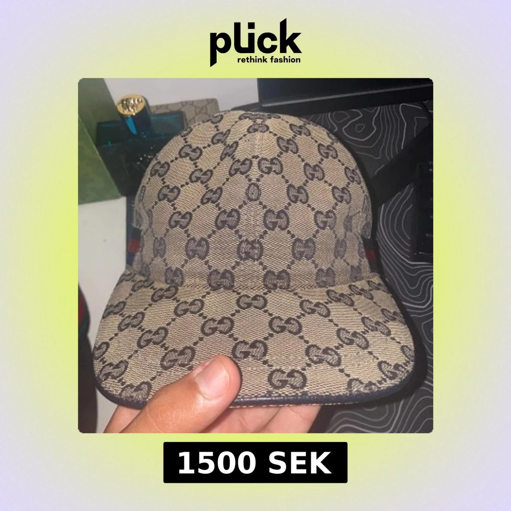Säljer en beige keps från Gucci med ikoniskt GG-mönster i mörkblått. Kepsen har justerbar rem bak i skinn och snygga detaljer med blå och röd rand på sidorna. Materialet är bomull och skinn, perfekt för dig som vill ha en lyxig och trendig look.