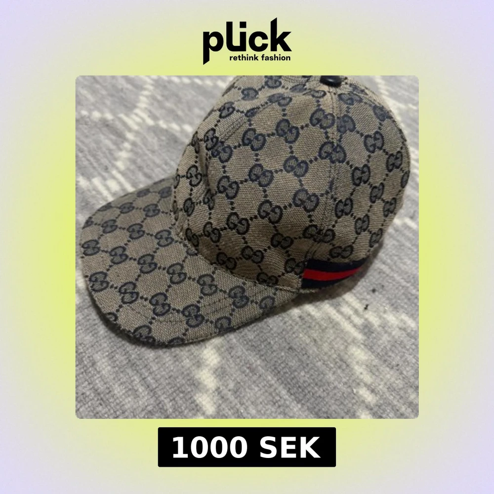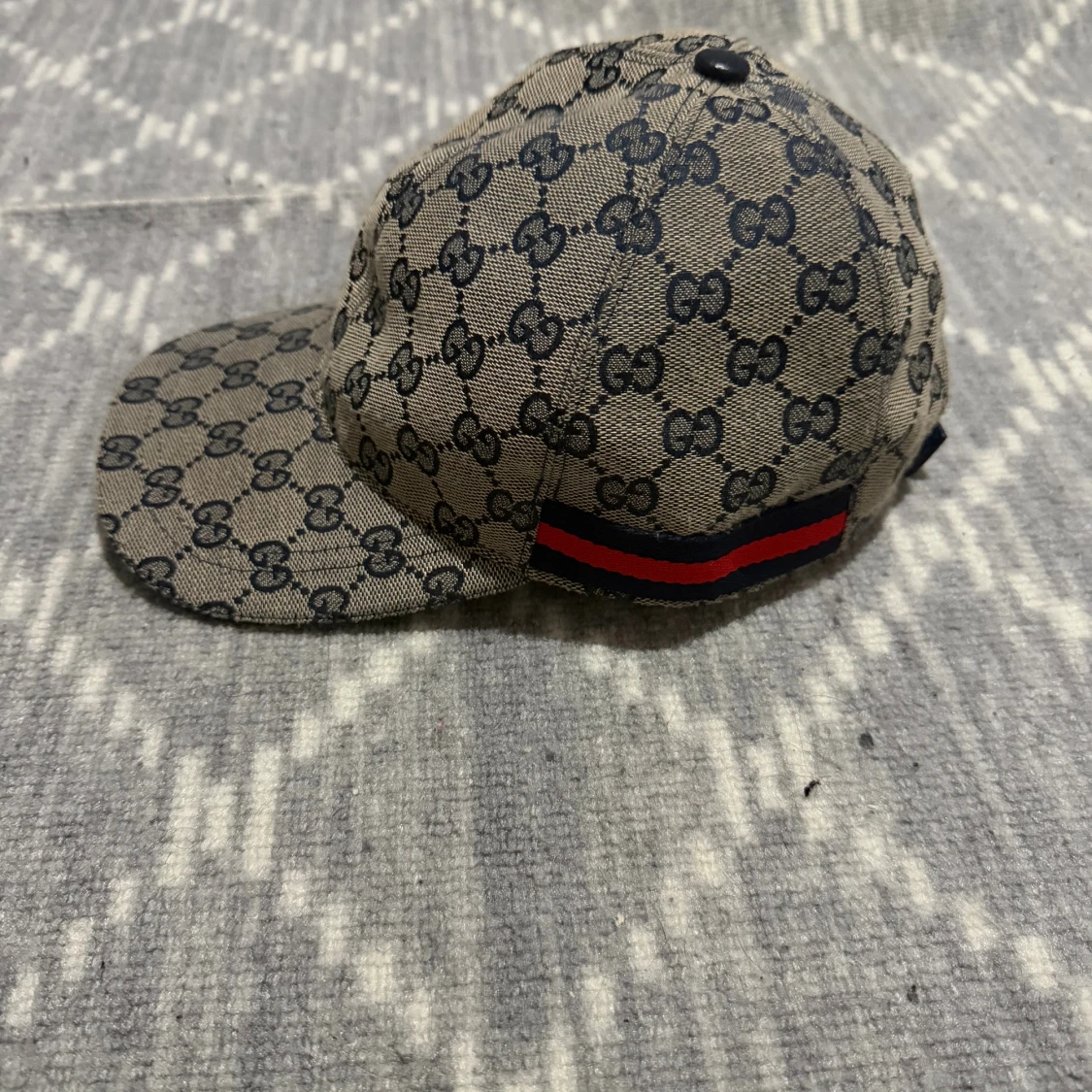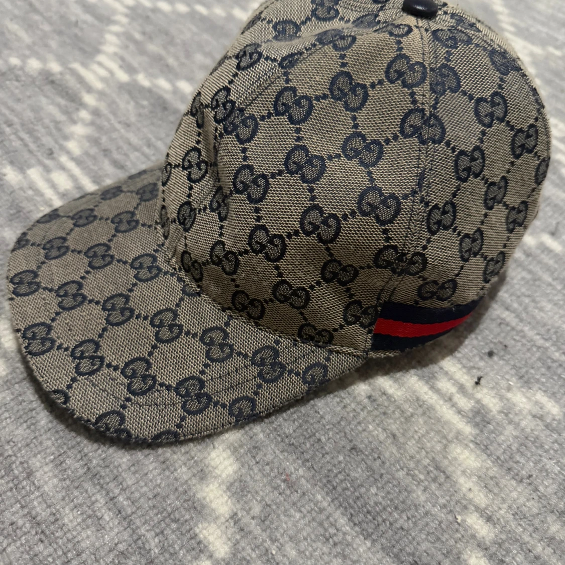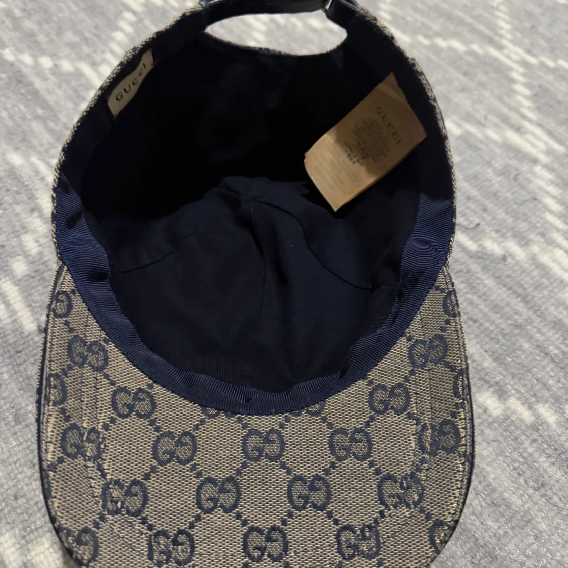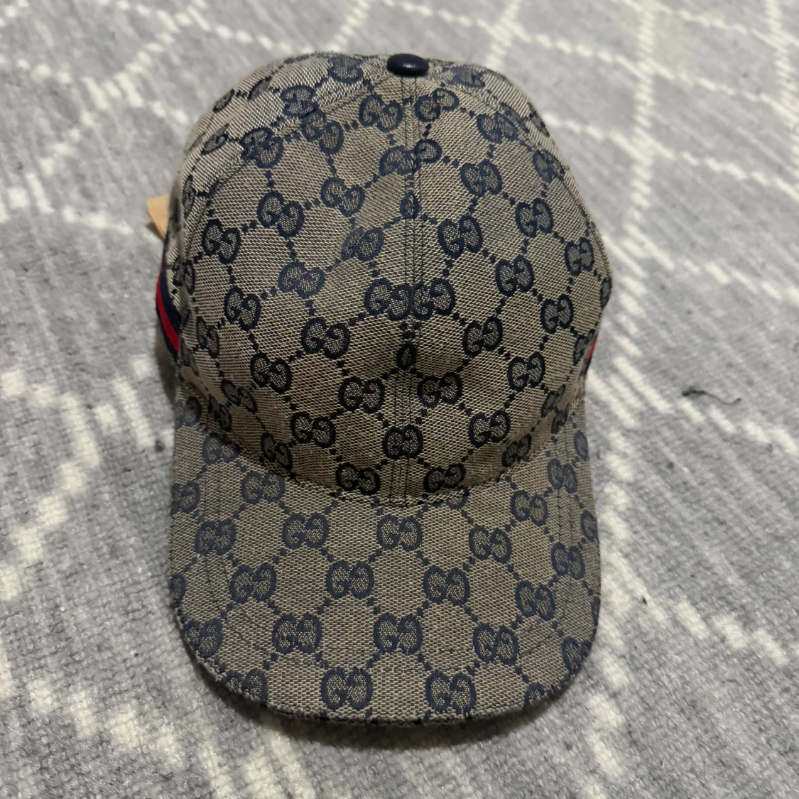 Snygg keps från Gucci i beige med klassiskt GG-monogram i mörkblått över hela kepsen. Baksidan har en ikonisk röd och marinblå rand. Kepsen är tillverkad i bomullscanvas och har justerbar rem baktill för perfekt passform.