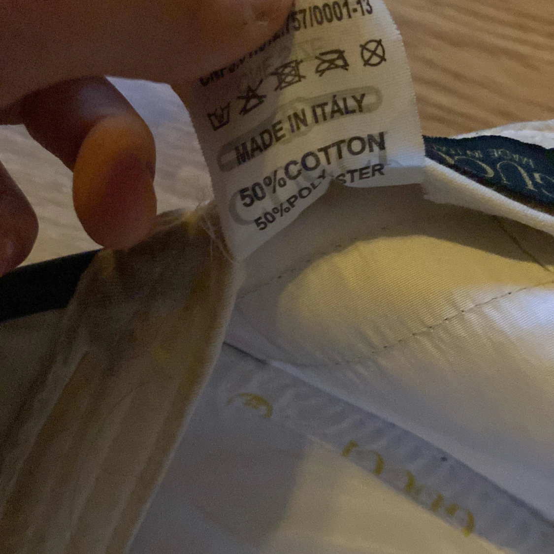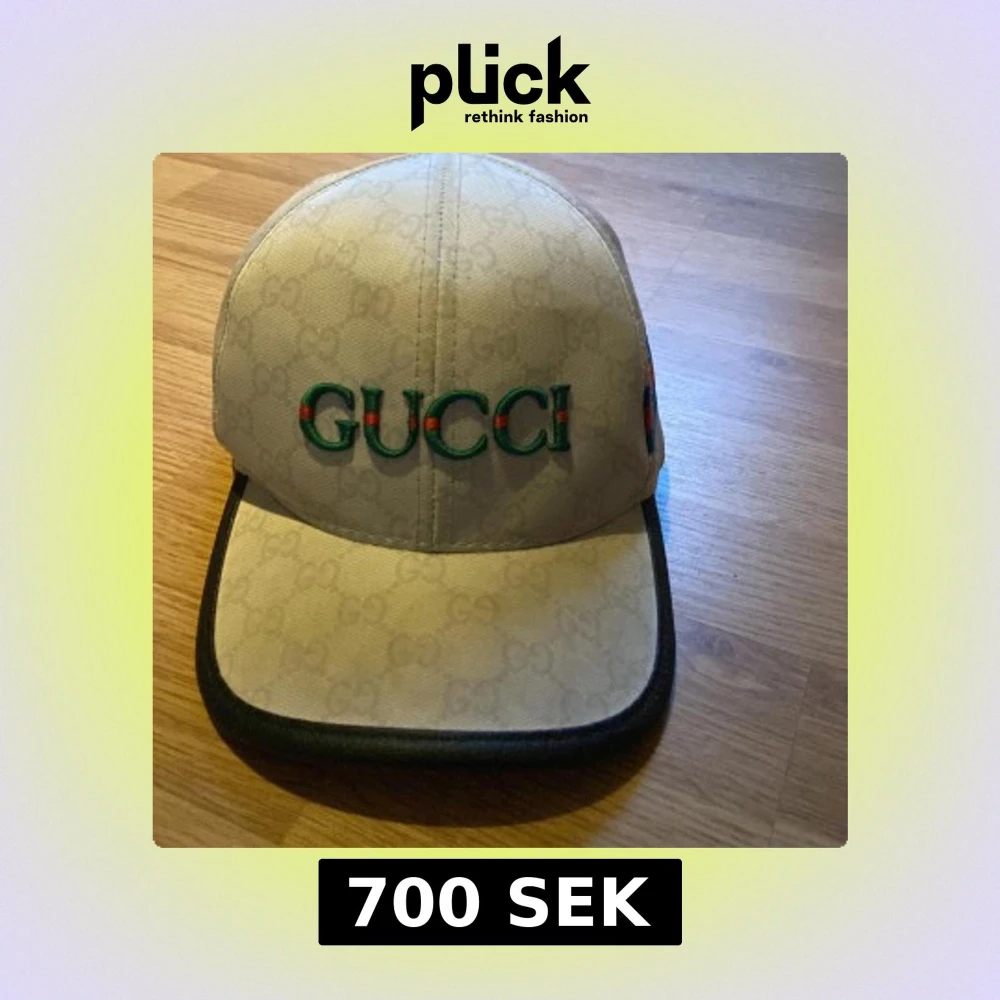 Snygg beige keps från Gucci med broderad logga framtill i grönt och rött. Kepsen har klassiskt mönster, svarta detaljer på skärmen och ett band i grönt och rött på sidan. Tillverkad i 50% bomull och 50% polyester.