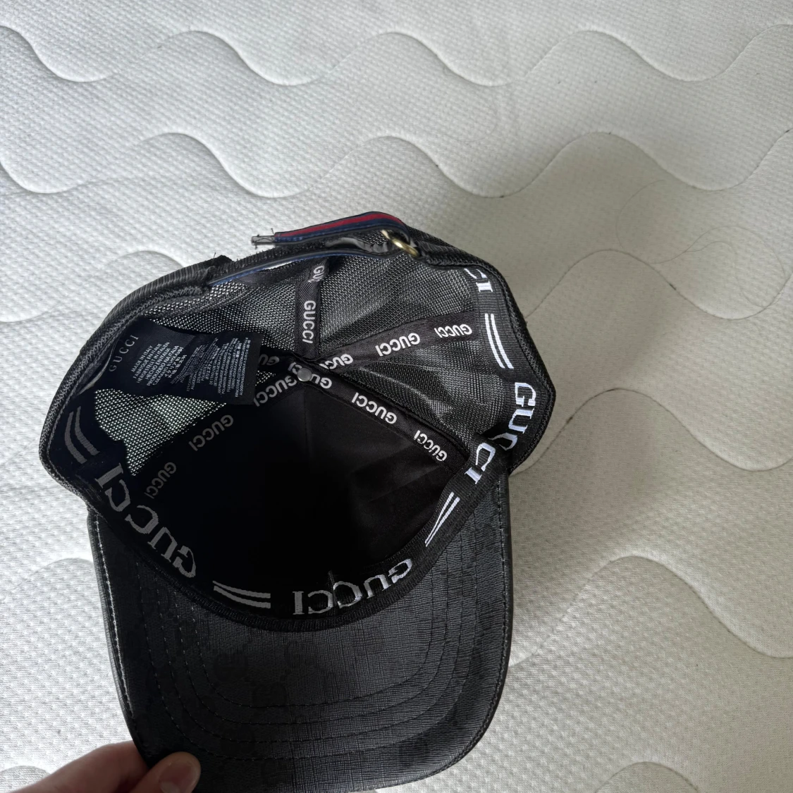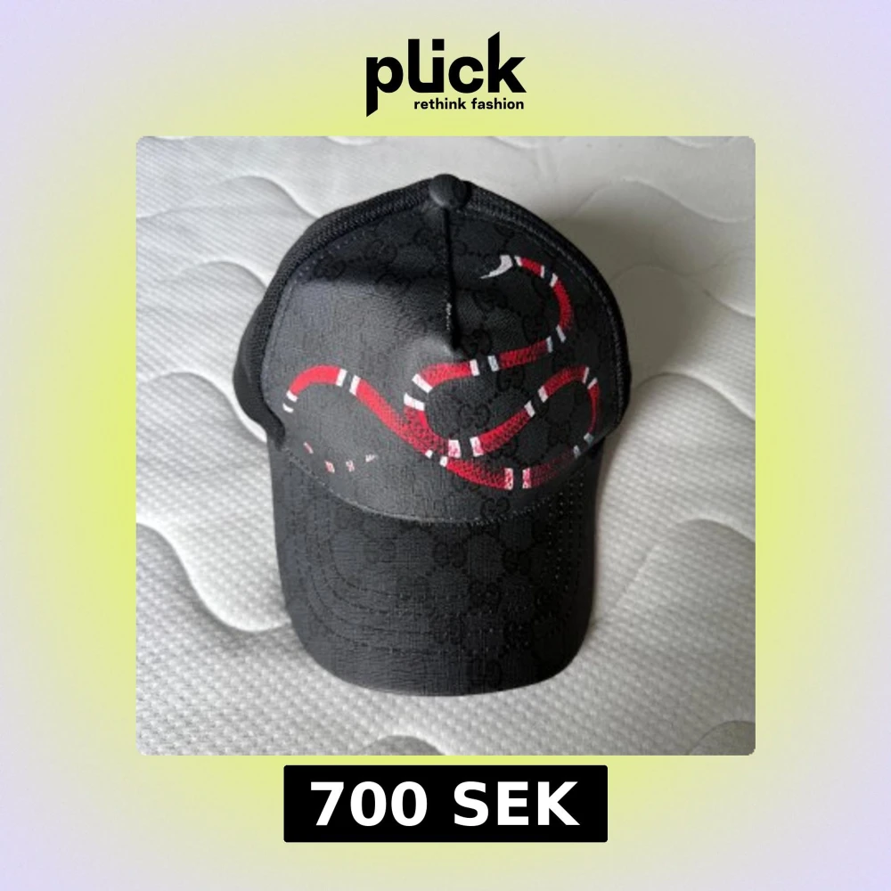 Snygg svart keps från Gucci med ikoniskt GG-mönster och en röd-vit orm tryckt på framsidan. Kepsen har mesh på baksidan och justerbar rem med metallspänne. Perfekt för dig som vill sticka ut med en lyxig accessoar.