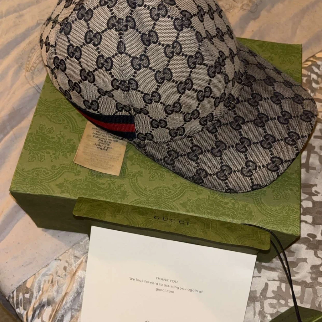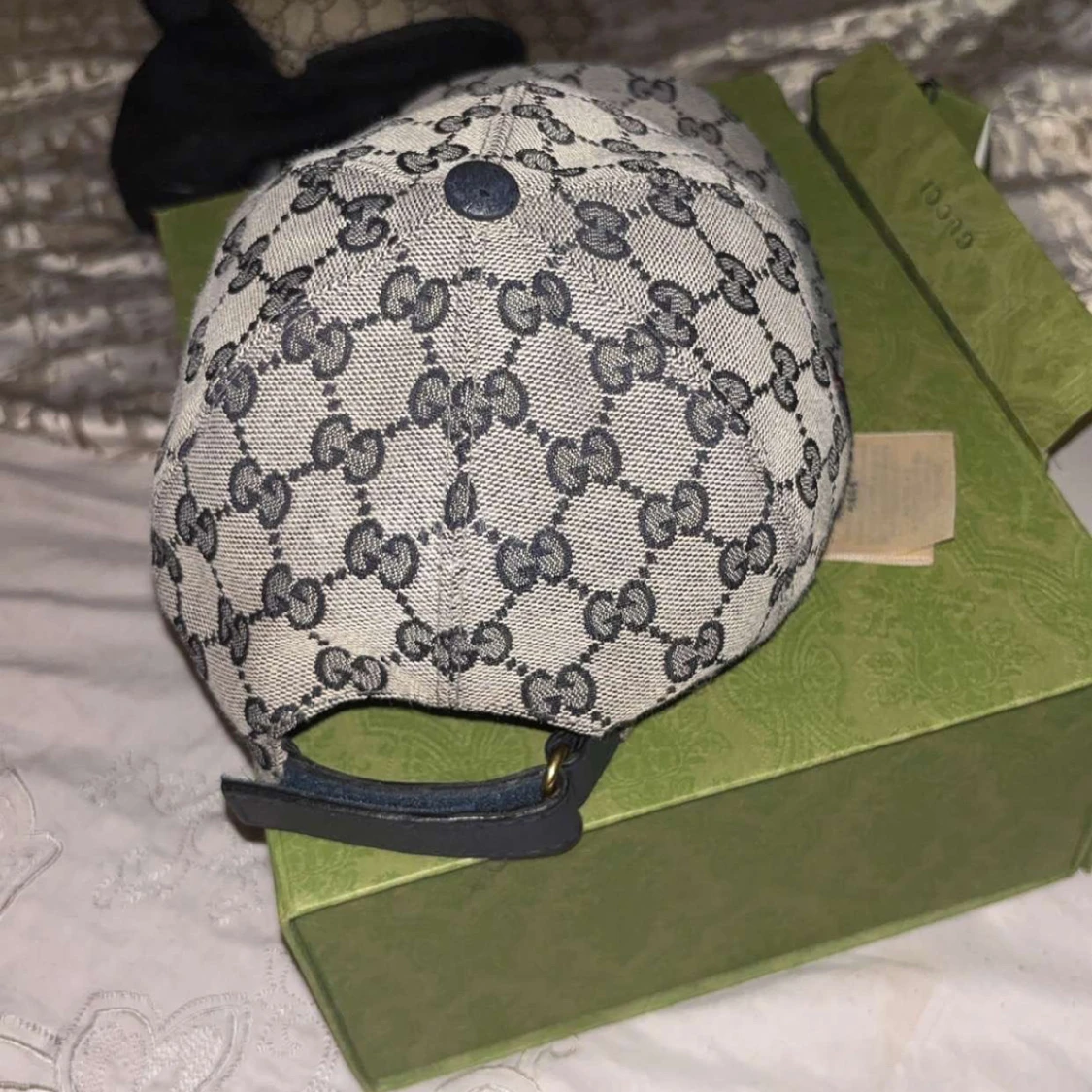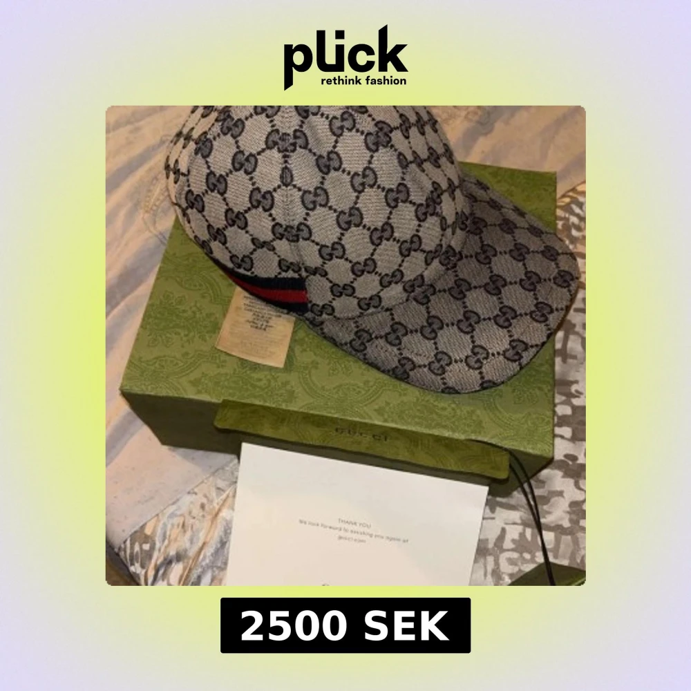 Säljer en snygg keps från Gucci i beige och mörkblått med klassiskt GG-monogram över hela kepsen. Kepsen har justerbar rem bak i blått läder och en röd-blå rand på sidan. Tillverkad i bomullscanvas med detaljer i läder. Perfekt för dig som gillar exklusiva accessoarer.