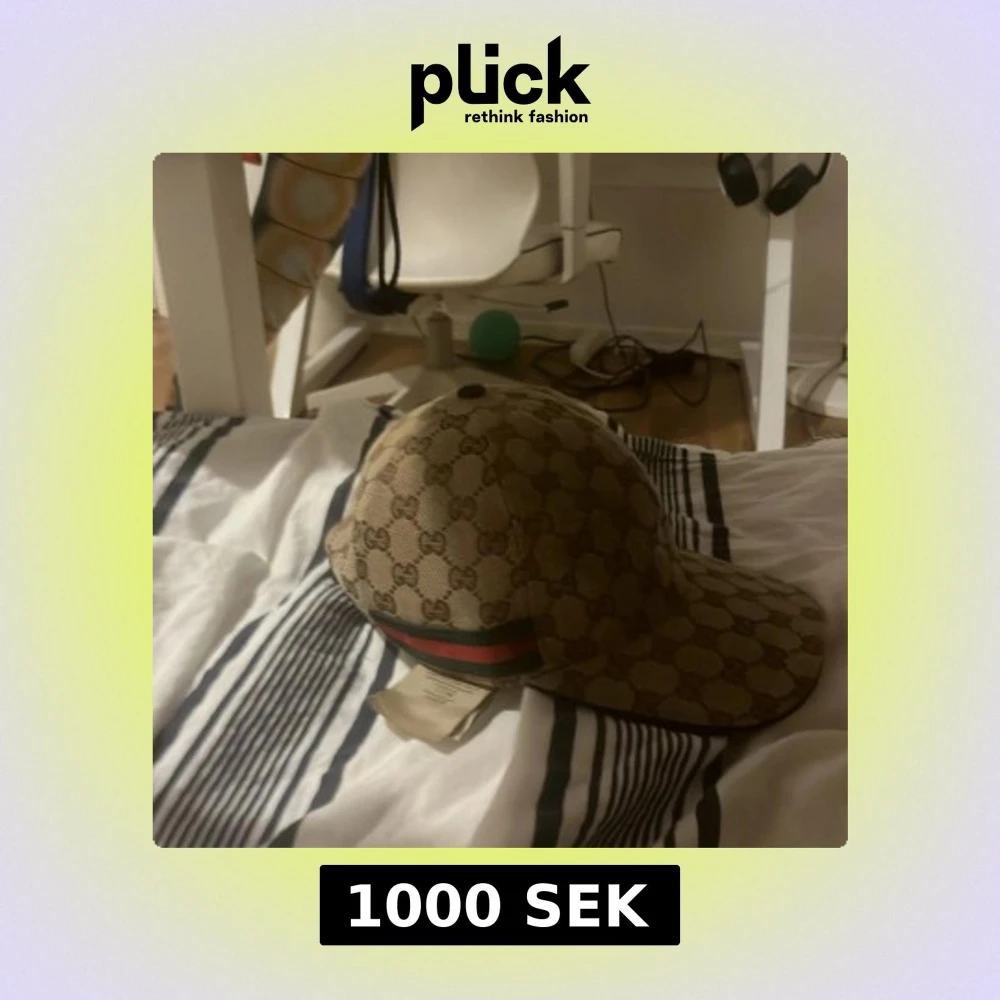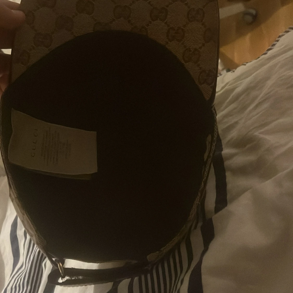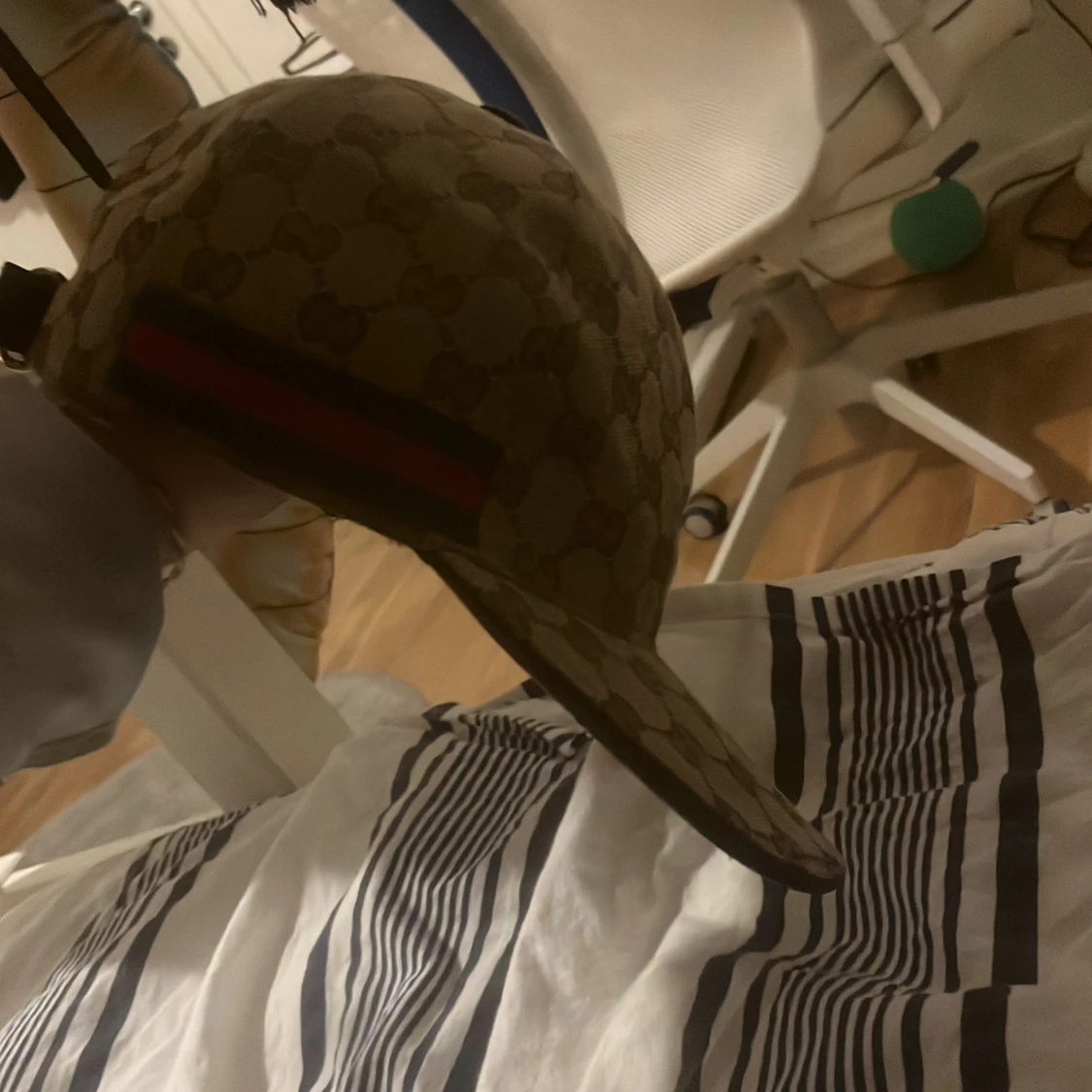 Säljer en beige keps från Gucci med klassiskt GG-monogram över hela kepsen och en röd-grön rand på sidan. Justerbar rem baktill. Perfekt för dig som gillar lyxiga accessoarer och vill sticka ut.
