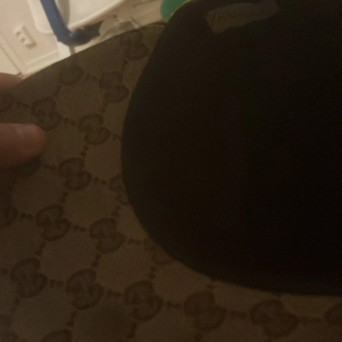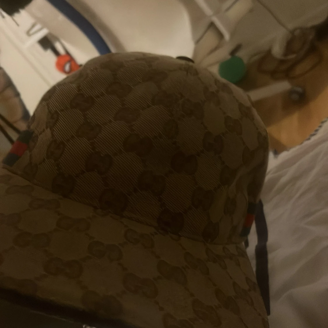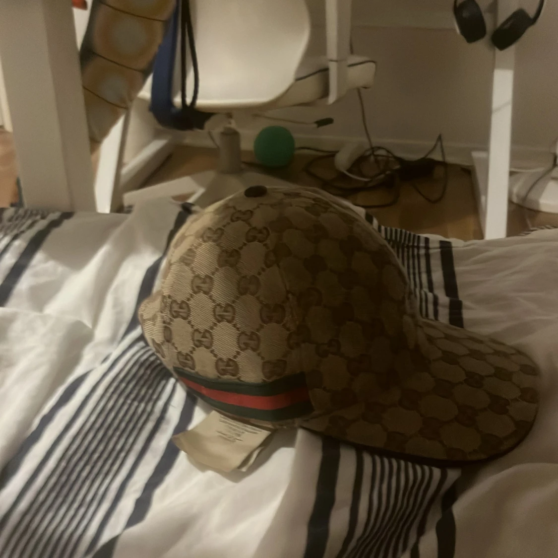 Säljer en beige keps från Gucci med klassiskt GG-monogram över hela kepsen och en röd-grön rand på sidan. Justerbar rem baktill. Perfekt för dig som gillar lyxiga accessoarer och vill sticka ut.
