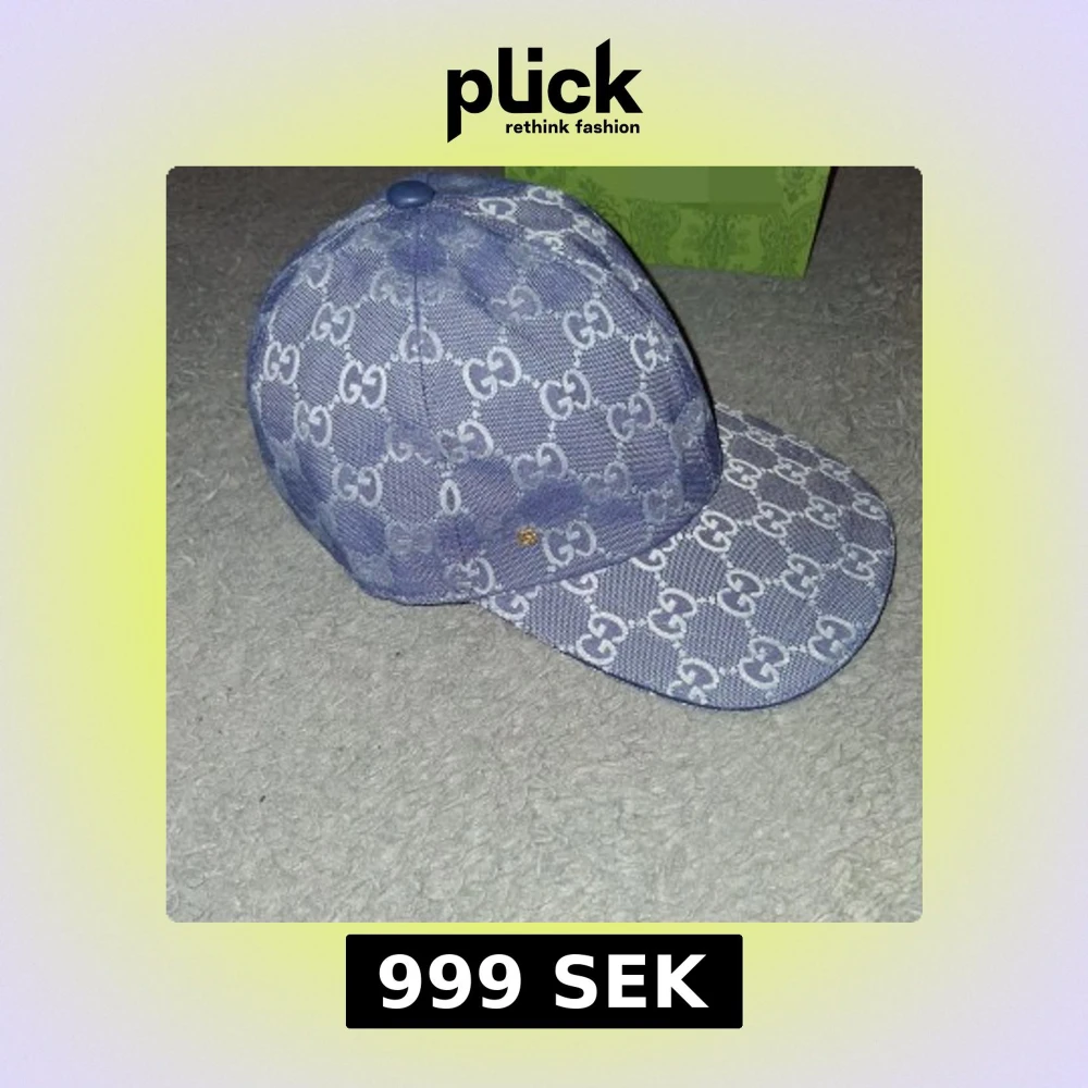 Säljer en blå keps med ikoniskt GG-mönster i vitt över hela kepsen. Kepsen har böjd skärm, justerbart spänne bak i blått skinn och en liten guldfärgad GG-detalj på sidan. Materialet är bomull och skinn, vilket ger en lyxig känsla.
