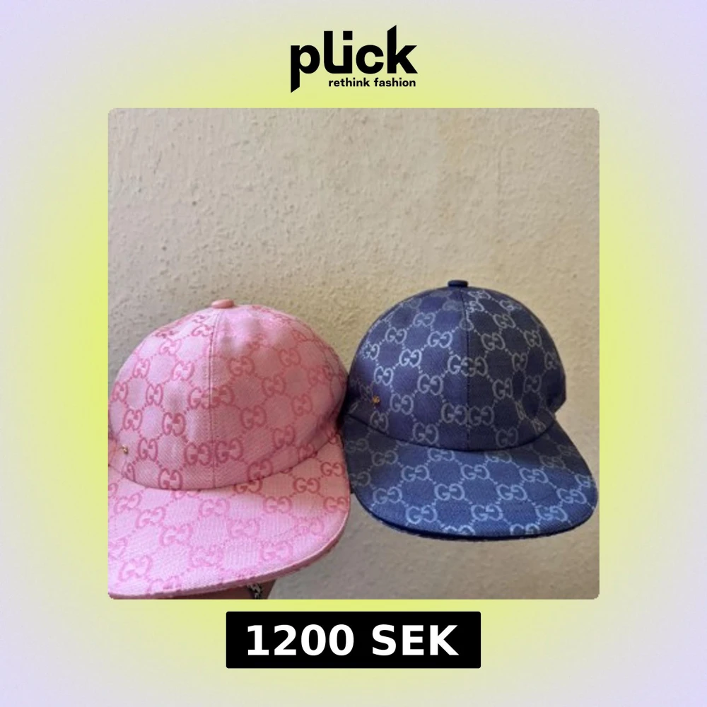 Två snygga Gucci kepsar med GG-monogram över hela kepsen. En i ljusrosa och en i marinblå, båda med böjd skärm och klassisk passform. Tillverkade i bomullscanvas med tydlig logga och justerbar baksida. Perfekt för dig som vill sticka ut med lyxig streetstyle.