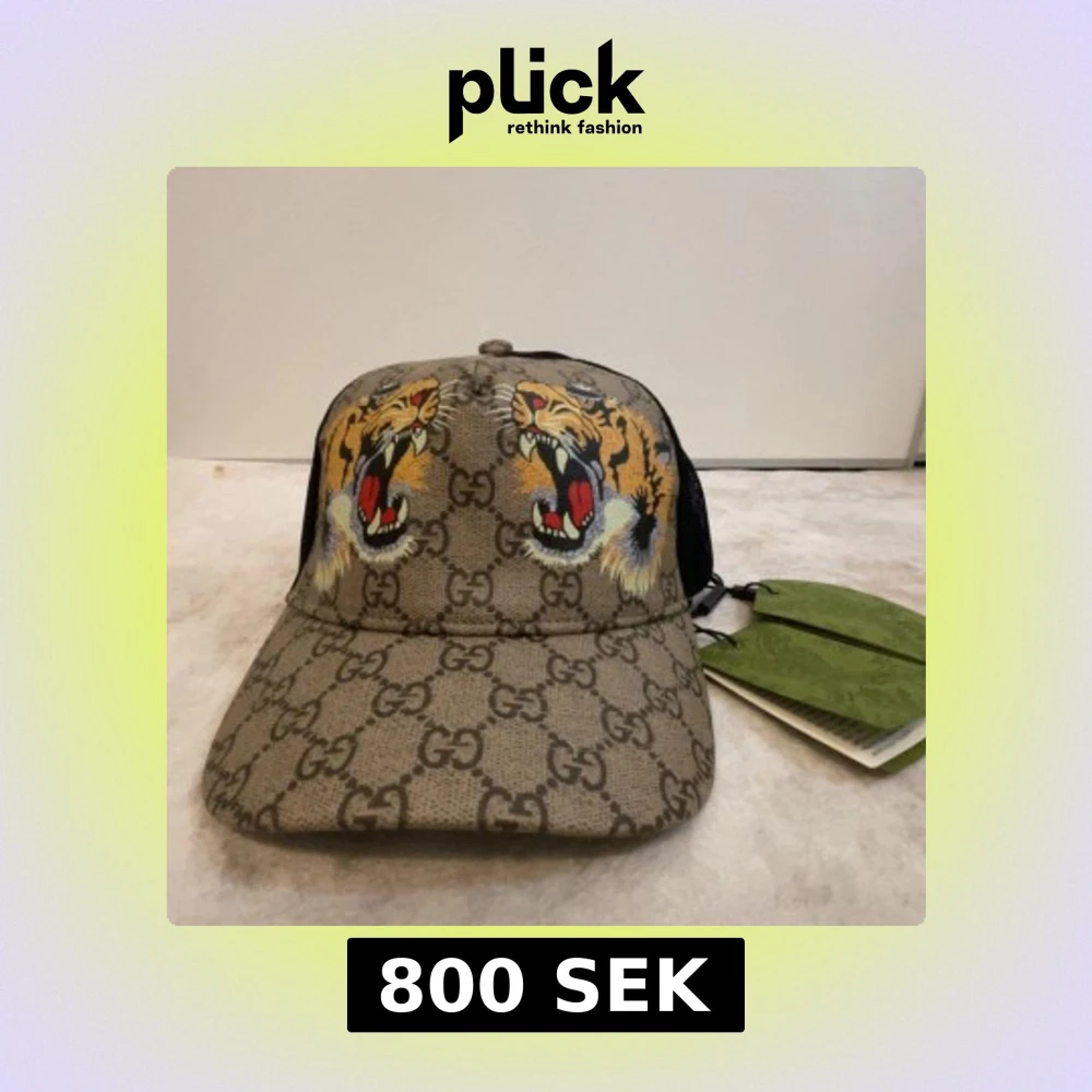 Snygg keps från Gucci med klassiskt GG-monogram i beige och brunt, prydd med två färgstarka tigrar framtill. Baksidan är i svart mesh för extra ventilation och justerbar passform med grön-röd randig detalj. Perfekt statement-piece för dig som vill sticka ut.