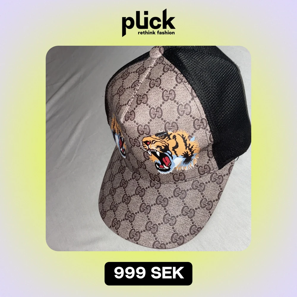 Säljer en snygg Gucci keps med ett coolt tigertryck. Kepsen har ett klassiskt Gucci-mönster i beige och brunt, med svarta mesh-detaljer på sidorna. Perfekt för att ge din outfit en lyxig touch. Passar bra till både vardag och fest!
