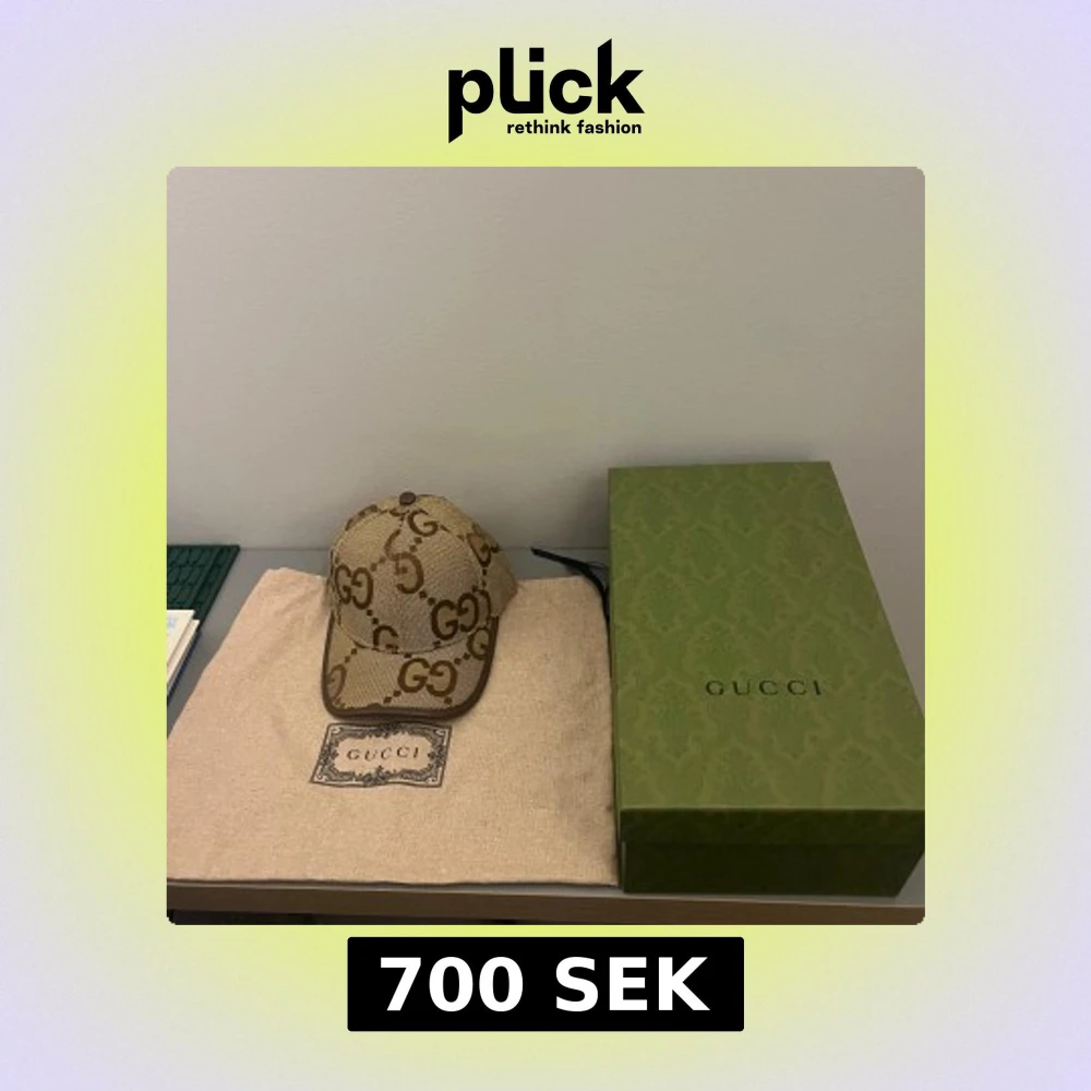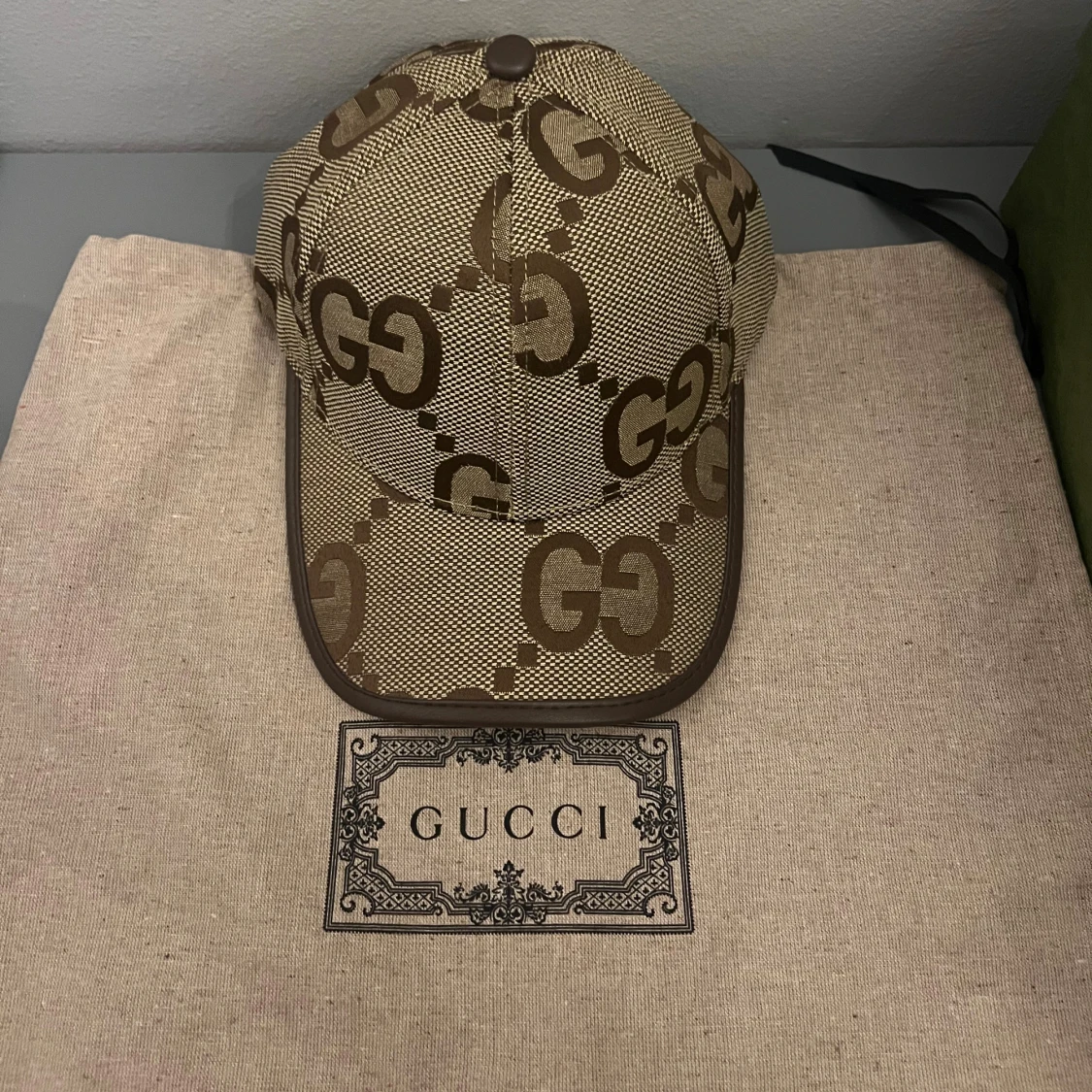 Snygg beige keps från Gucci med bruna GG-loggor över hela kepsen. Klassisk böjd skärm och bruna detaljer längs kanterna. Tillverkad i slitstarkt material med exklusiv känsla, perfekt för dig som vill sticka ut med designerstil.