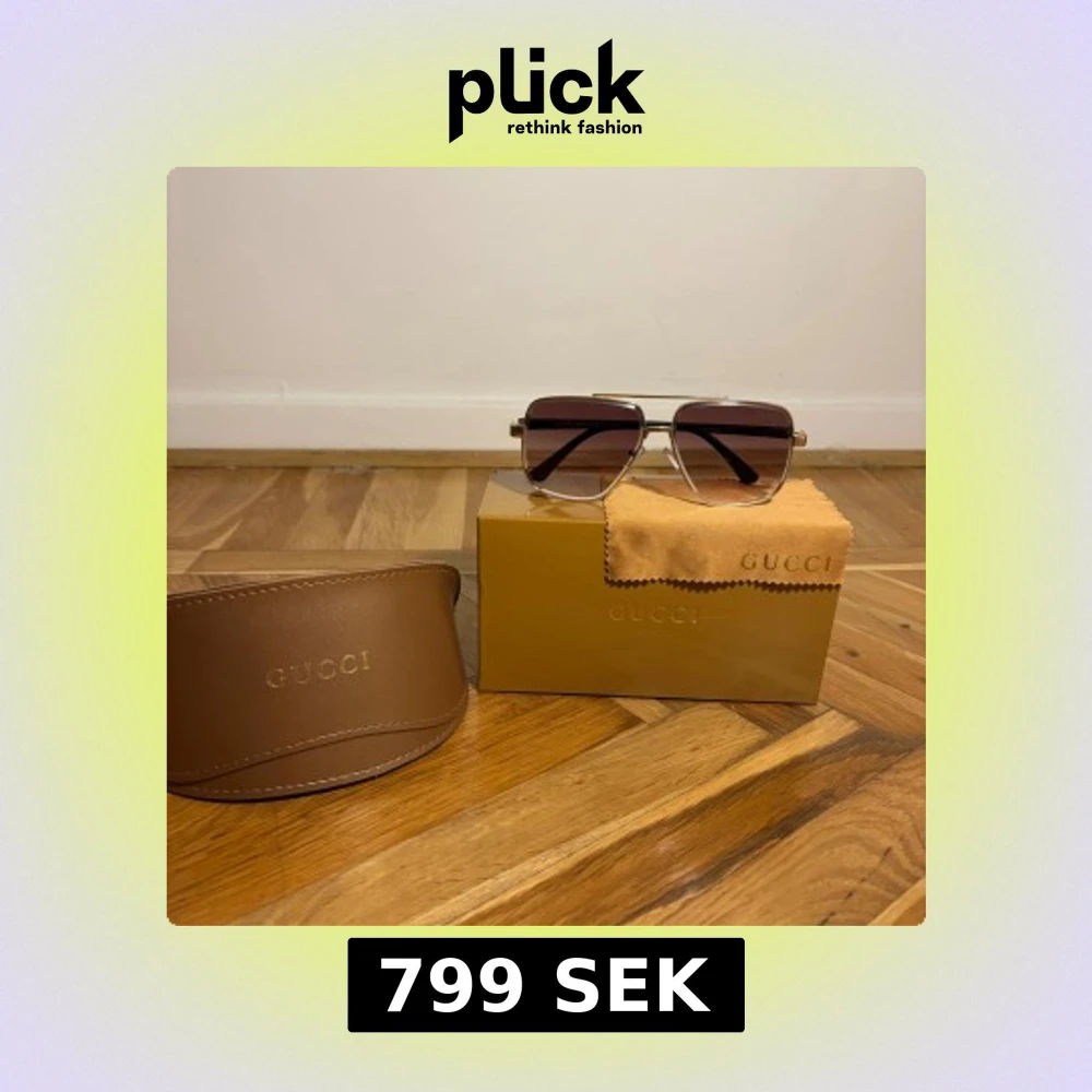 Snygga Gucci solglasögon med fyrkantig form och guldtonad metallram. Glasen är mörkbruna med gradient och har en cool retrovibe. Svarta skalmar och diskret Gucci-logga på linsen. Kommer med originalfodral och putsduk.