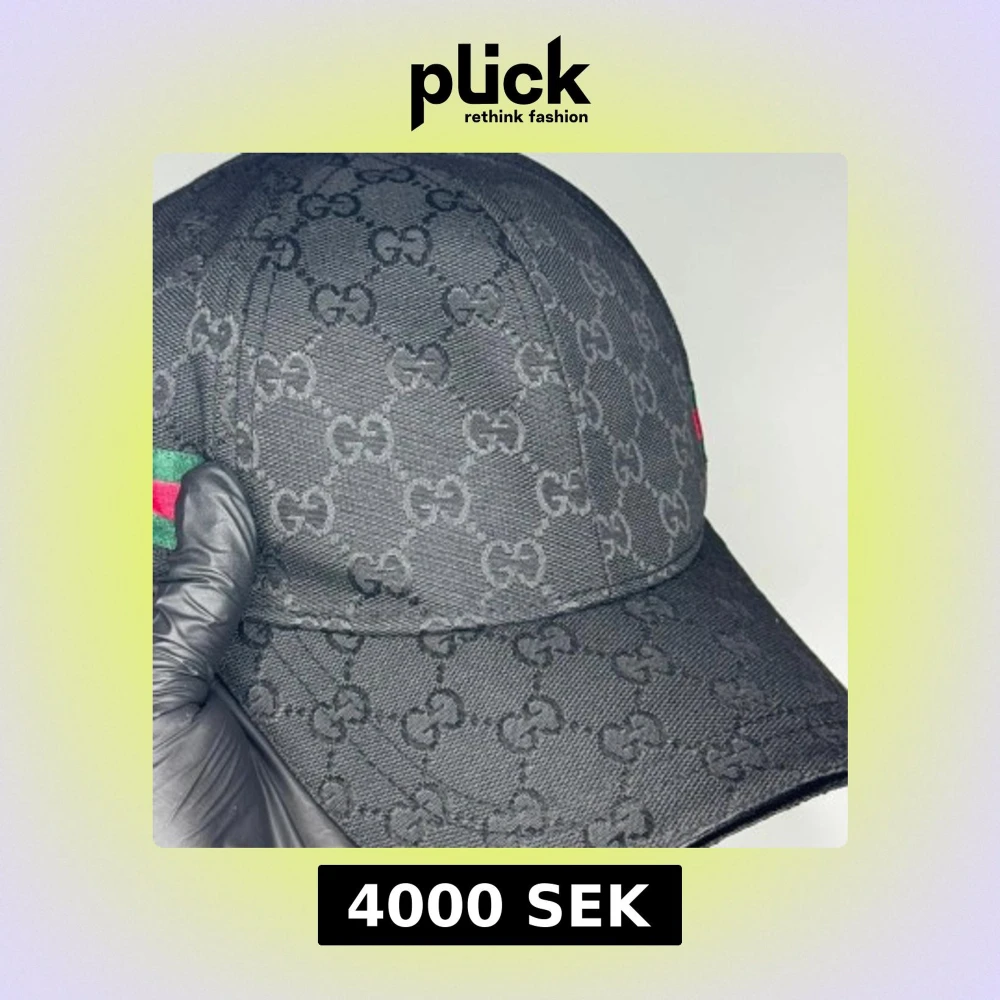 Snygg svart keps från Gucci med klassiskt GG-monogram över hela kepsen och en detalj i grönt och rött på sidan. Kepsen har böjd skärm och är tillverkad i slitstarkt material, perfekt för en trendig streetwear-look.