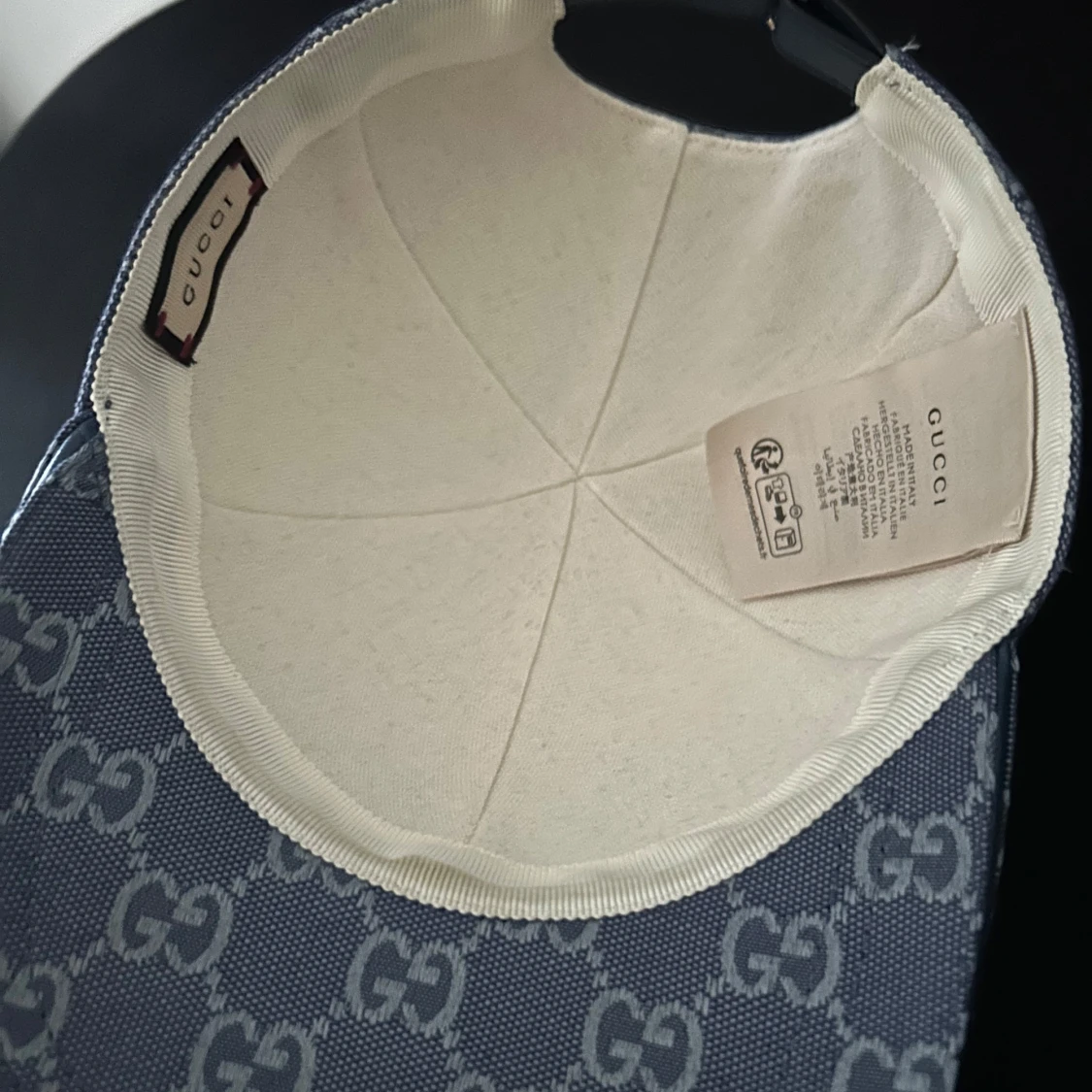 Snygg blå keps från Gucci med ikoniskt GG-mönster över hela kepsen. Tillverkad i bomullstyg med klassisk böjd skärm och justerbar baksida. Perfekt för dig som vill sticka ut med en exklusiv accessoar kespen är i ny sick