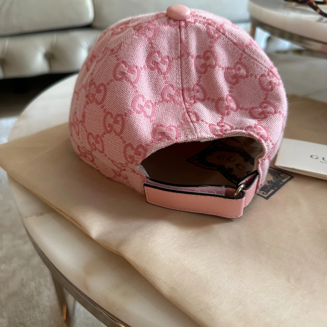 Exklusiv rosa keps från Gucci med ikoniskt GG-monogram över hela kepsen. Justerbar rem baktill i rosa läder och böjd skärm. Tillverkad i bomullstyg med snygg struktur och detaljer som sticker ut. Perfekt accessoar för att lyfta din outfit.