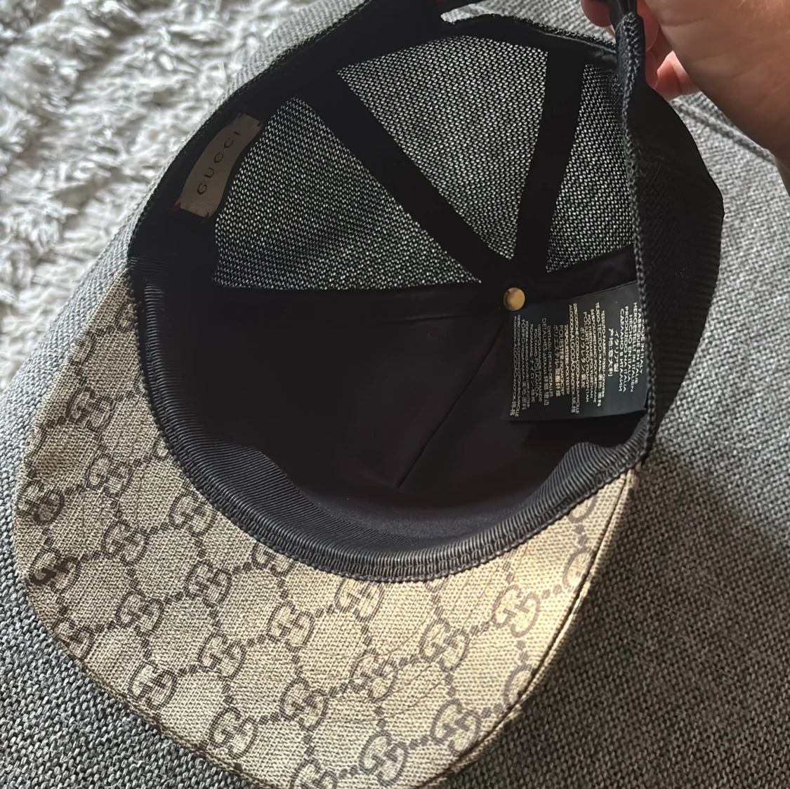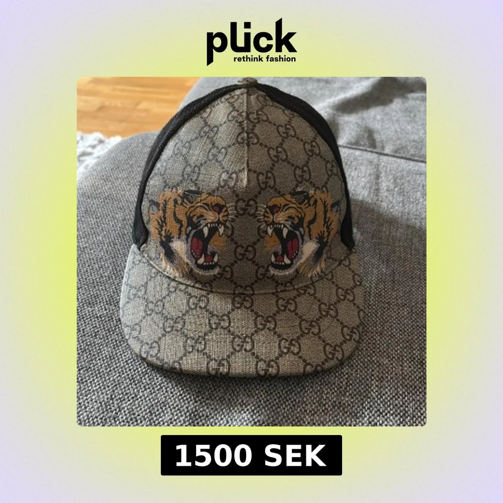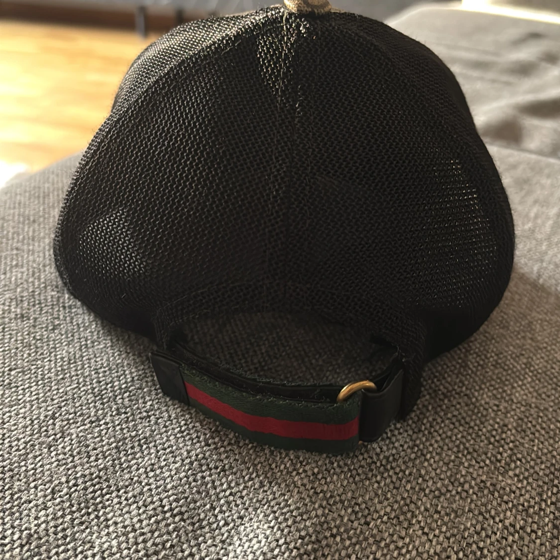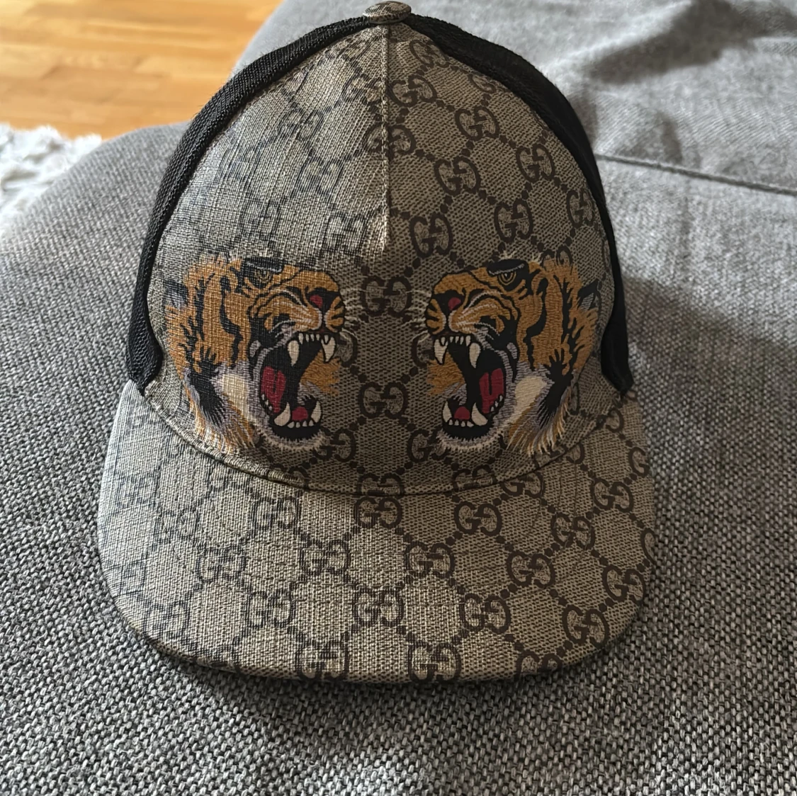 Snygg Gucci keps i beige med klassiskt GG-mönster och två stora tigertryck framtill. Baksidan är i svart mesh med justerbart band i grönt och rött. Kepsen är tillverkad i bomull och polyester, perfekt för dig som vill sticka ut med lyxig streetstyle.
