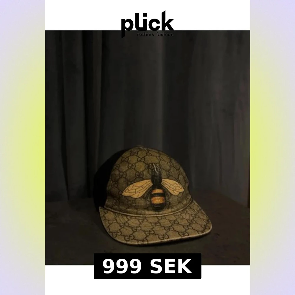 Snygg keps från Gucci med klassiskt GG-mönster i beige och brunt framtill, svart mesh på sidor och bak samt broderad bi på framsidan. Justerbar rem med grönt och rött band bak. Märkt med Gucci på insidan. Perfekt för dig som vill sticka ut.