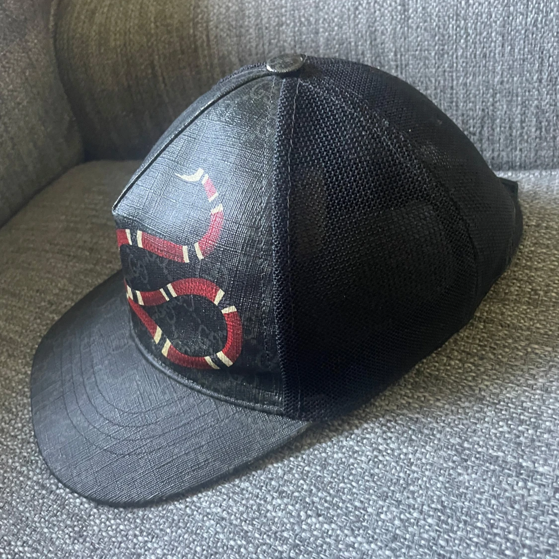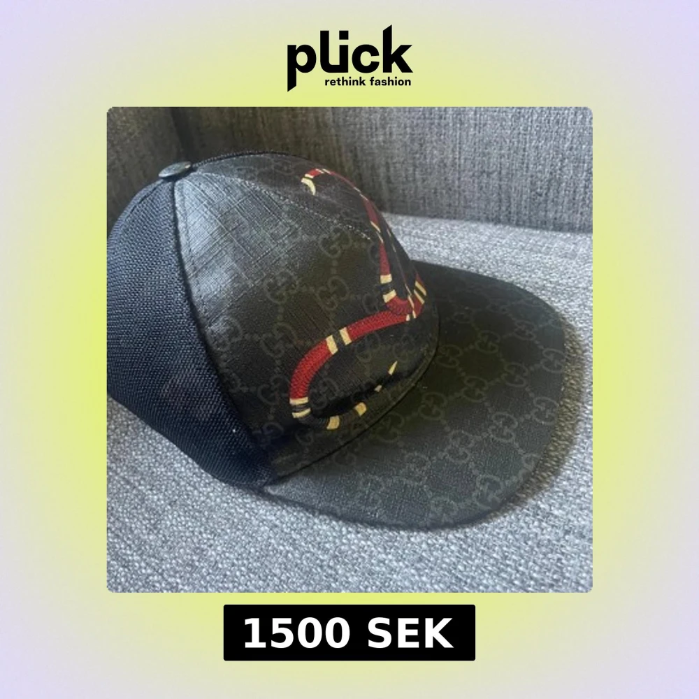 Snygg svart keps från Gucci med ett coolt ormmönster i rött och beige. Kepsen har ett diskret mönster av Gucci-loggor och är tillverkad i Italien. Perfekt för att ge din outfit en lyxig touch. Den är XS men passar 100% för er som har S då jag själv har S på mina andra Gucci kepsar