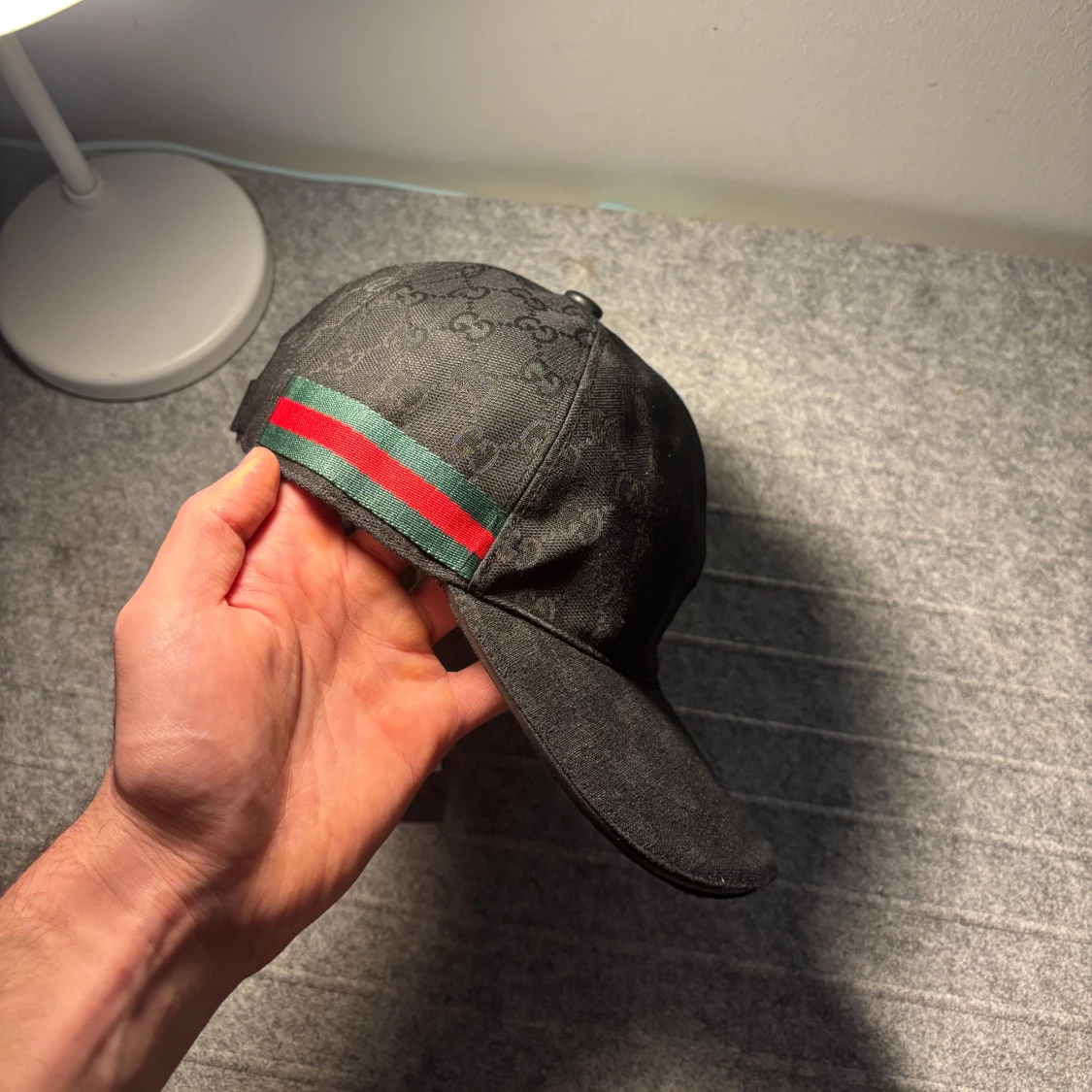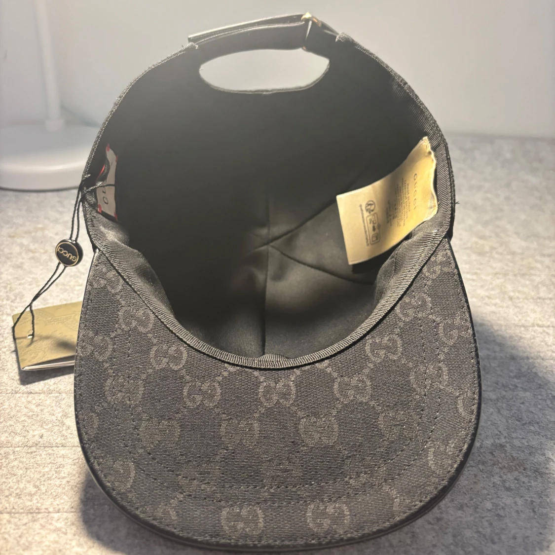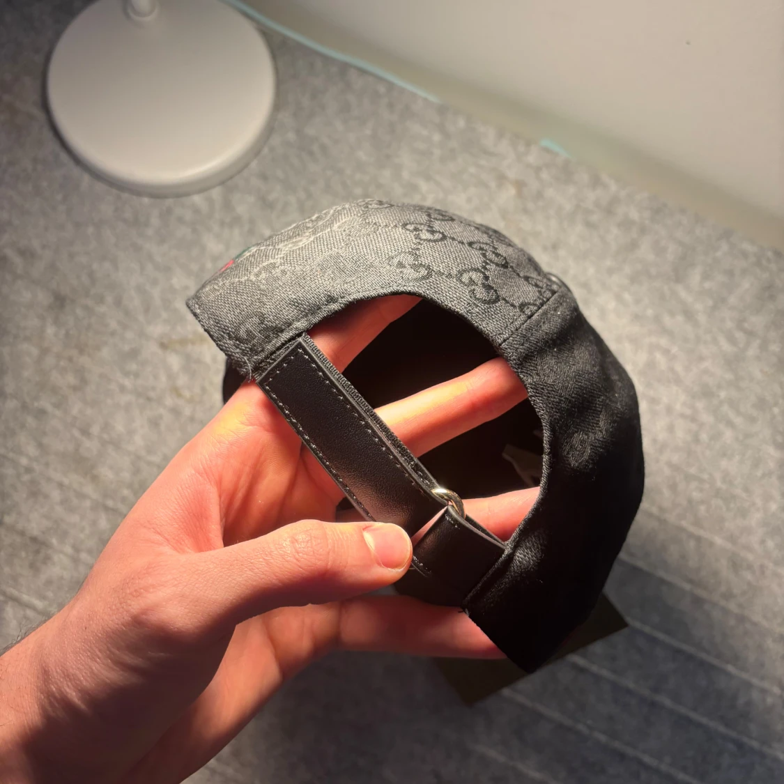 Snygg svart keps från Gucci med diskret mönster och klassiska gröna och röda ränder på sidan. Kepsen har en justerbar rem baktill för perfekt passform. Storlek ”M”