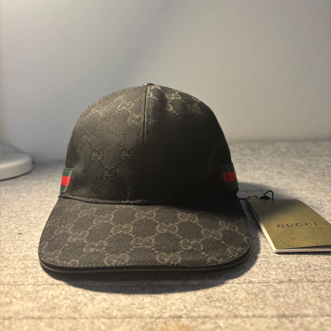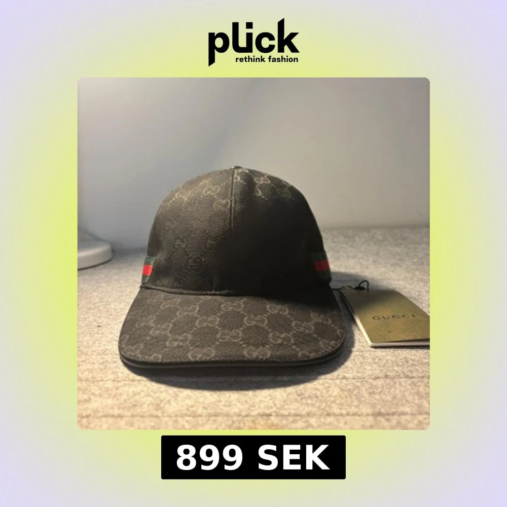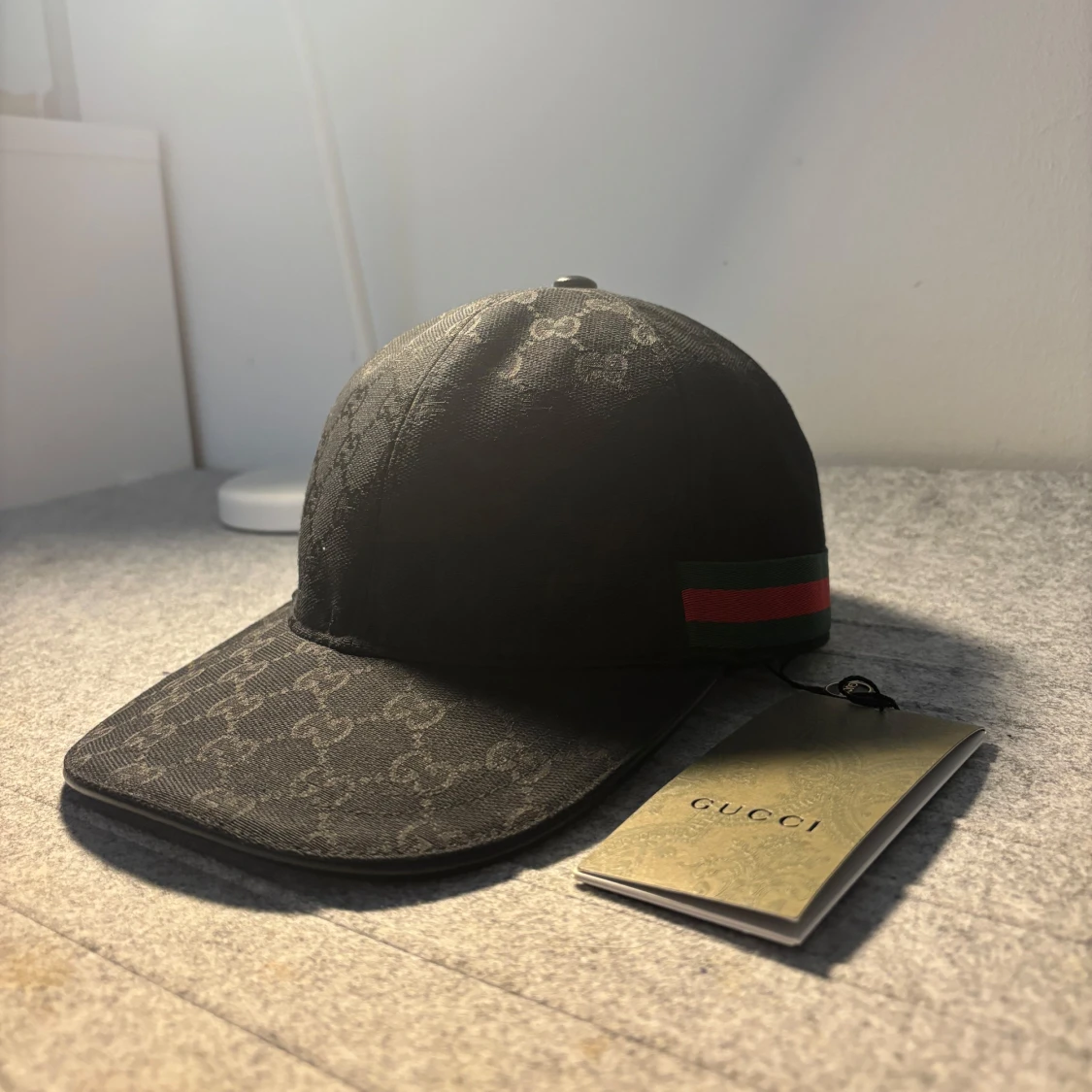 Snygg svart keps från Gucci med diskret mönster och klassiska gröna och röda ränder på sidan. Kepsen har en justerbar rem baktill för perfekt passform. Storlek ”M”