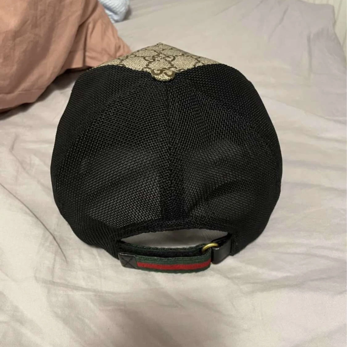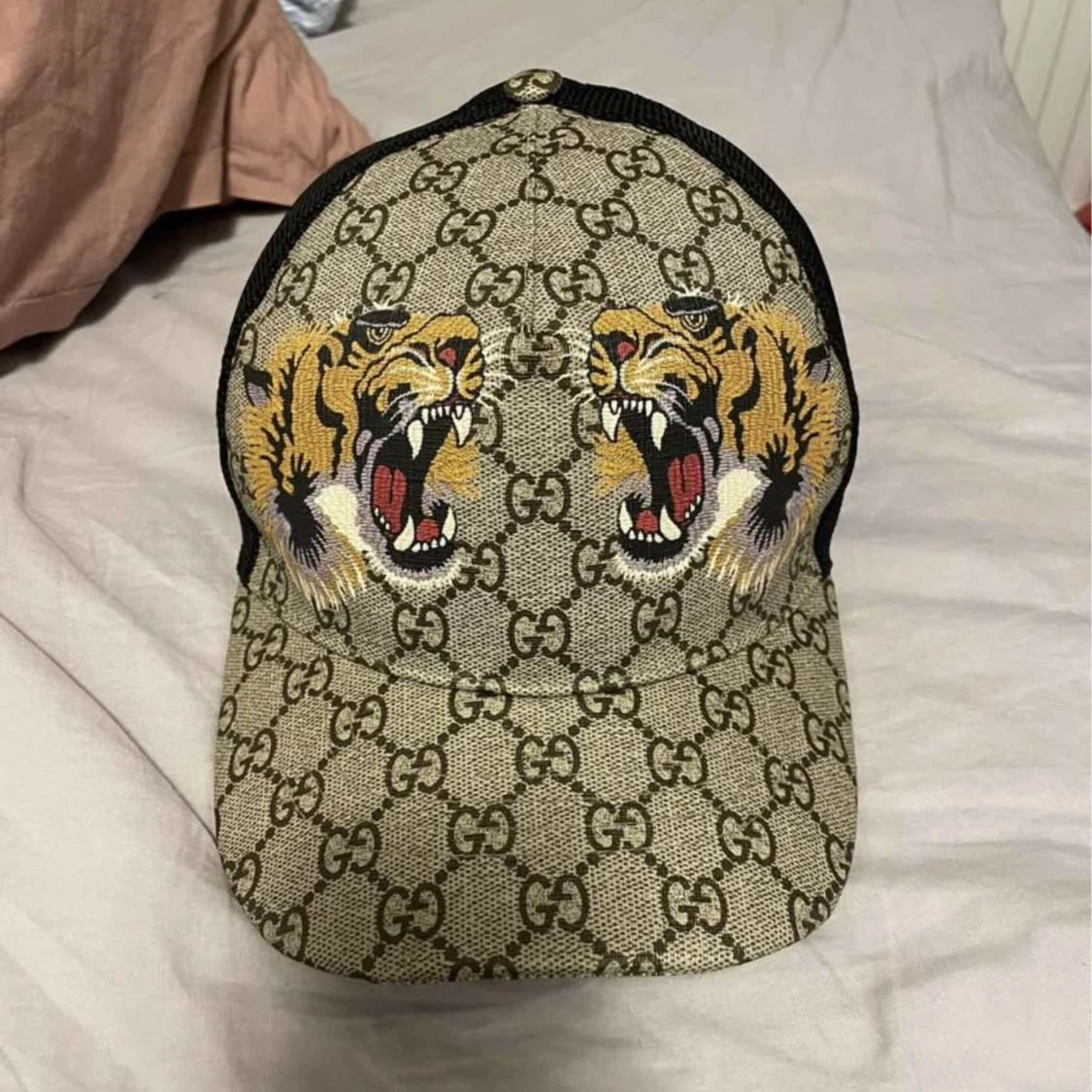 Snygg Gucci keps med klassiskt GG-monogram i beige och brunt, prydd med två broderade tigrar framtill. Baksidan är i svart mesh och justerbar med grön-röd detalj. Perfekt statement piece för dig som vill sticka ut.