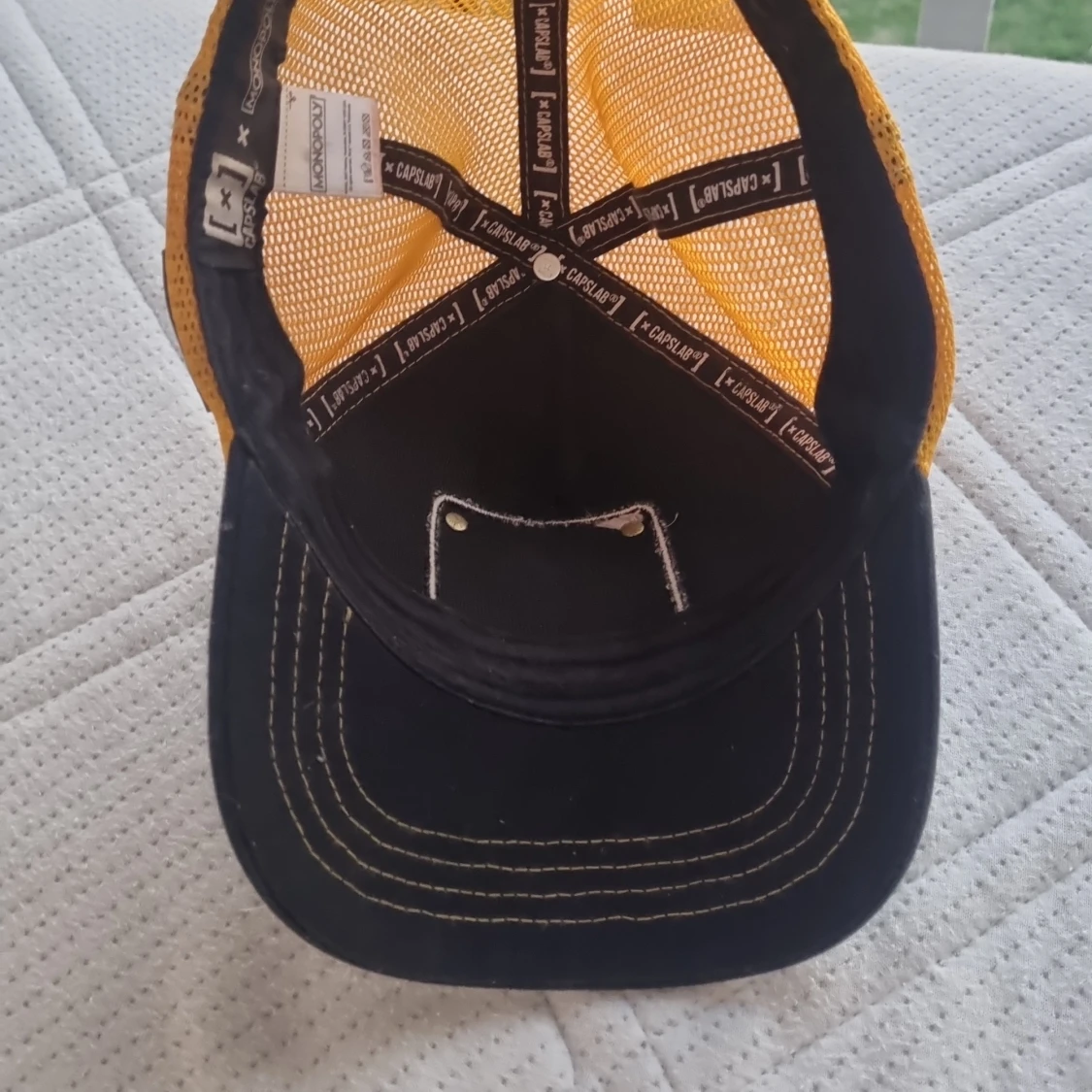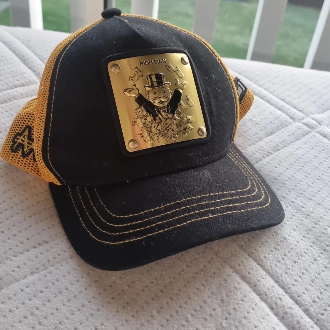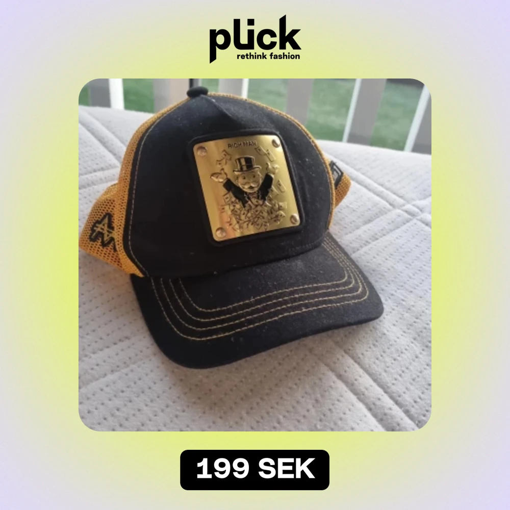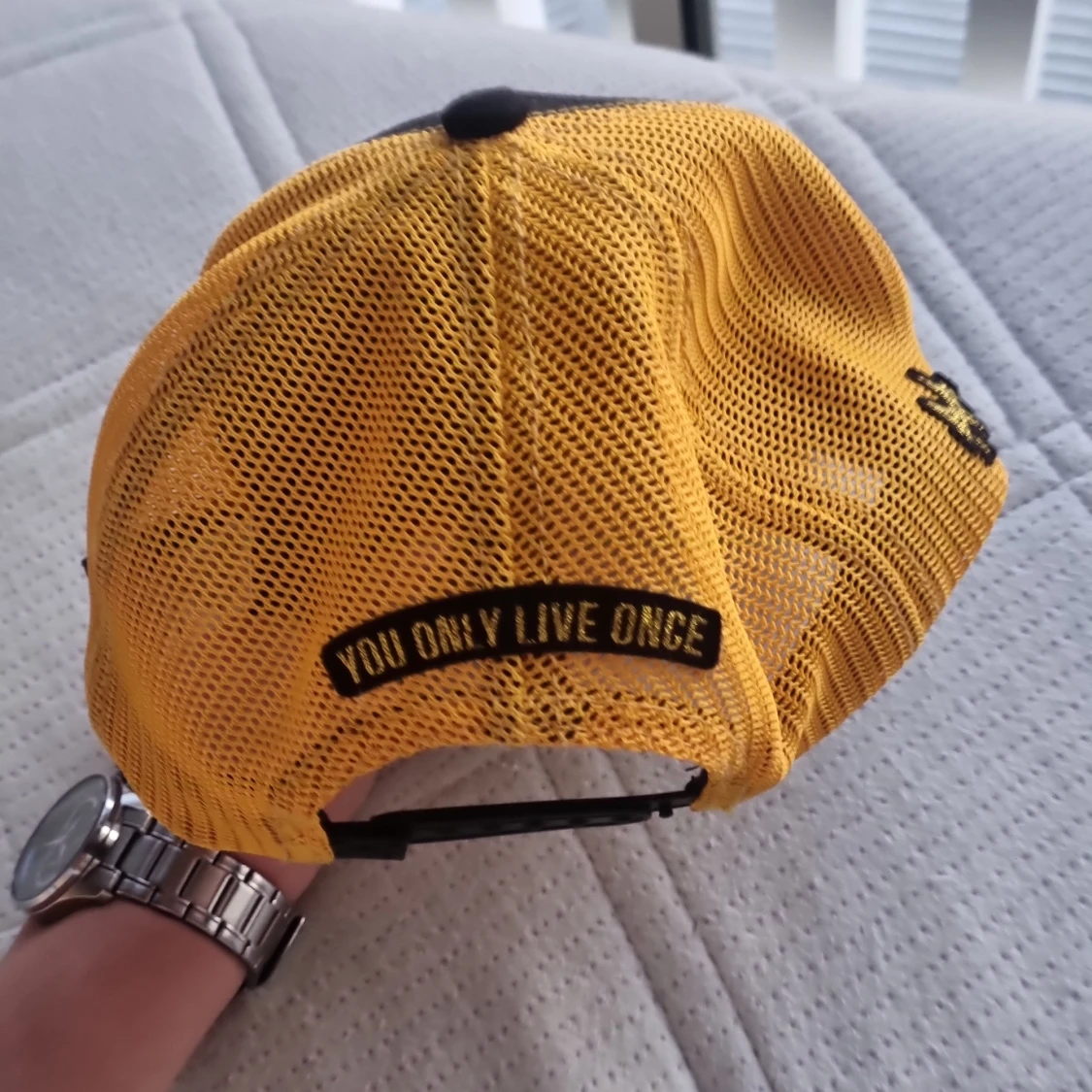 Säljer en cool svart och gul keps med en unik guldplatta framtill. Kepsen har ett nätmaterial i gult på sidorna och baksidan, vilket ger en skön ventilation. På baksidan står det 'You Only Live Once'. Perfekt för att sticka ut i mängden!