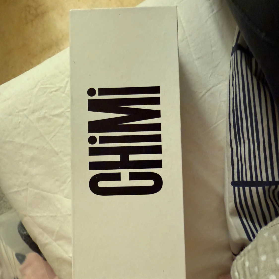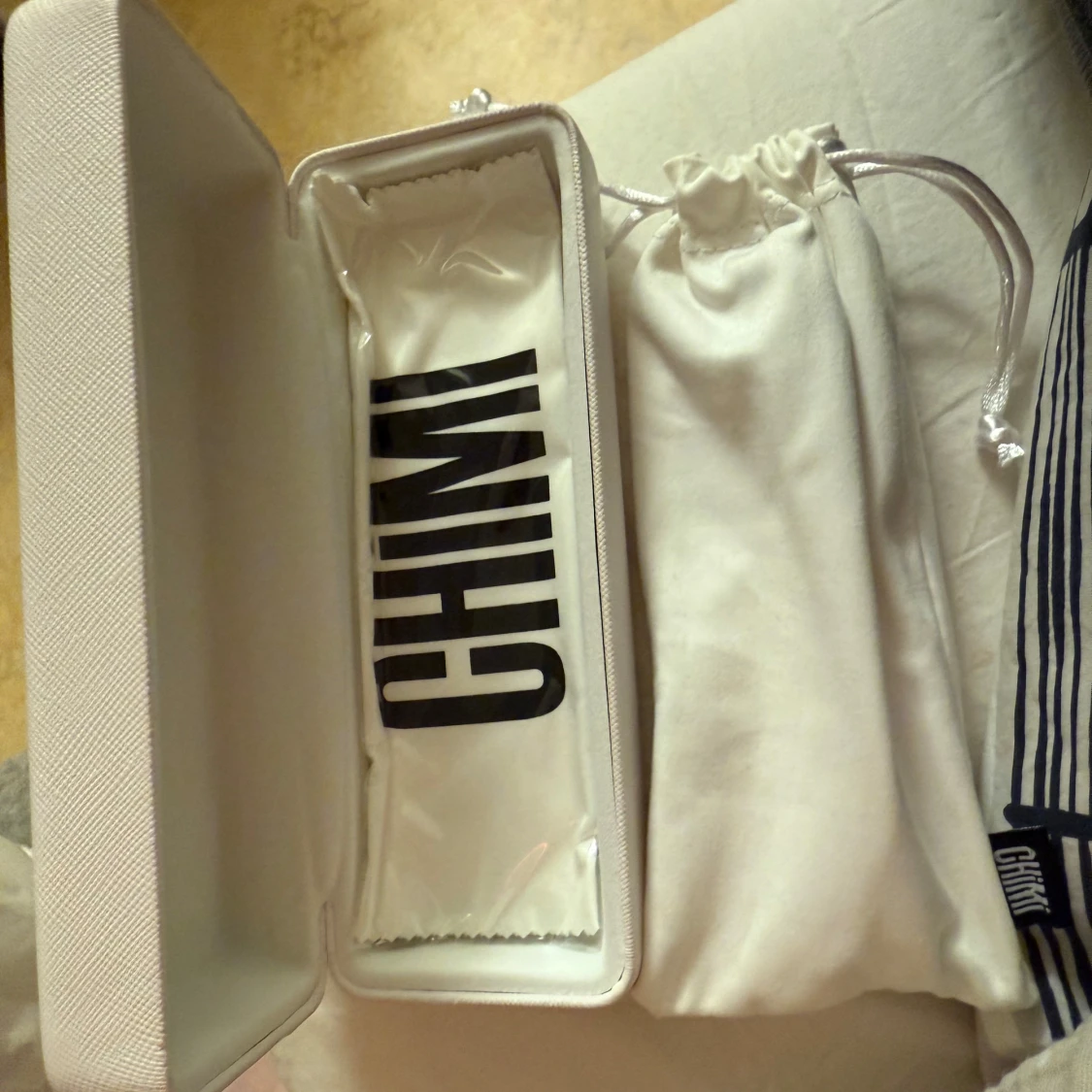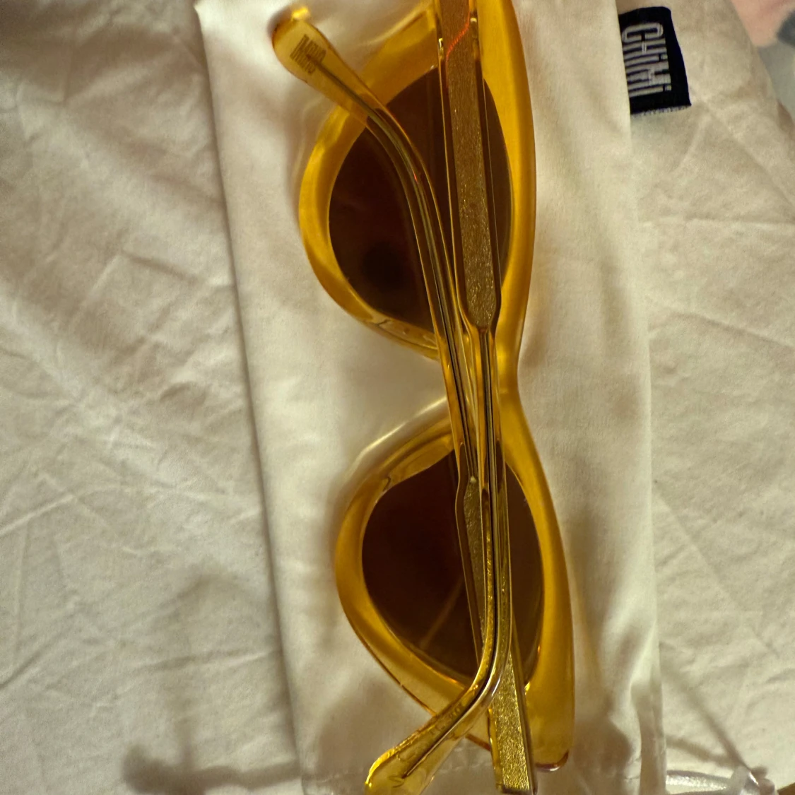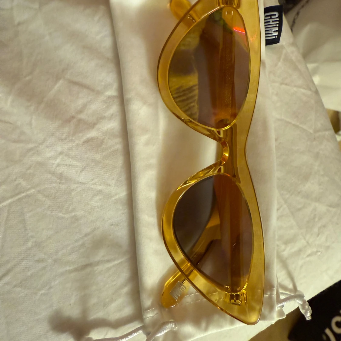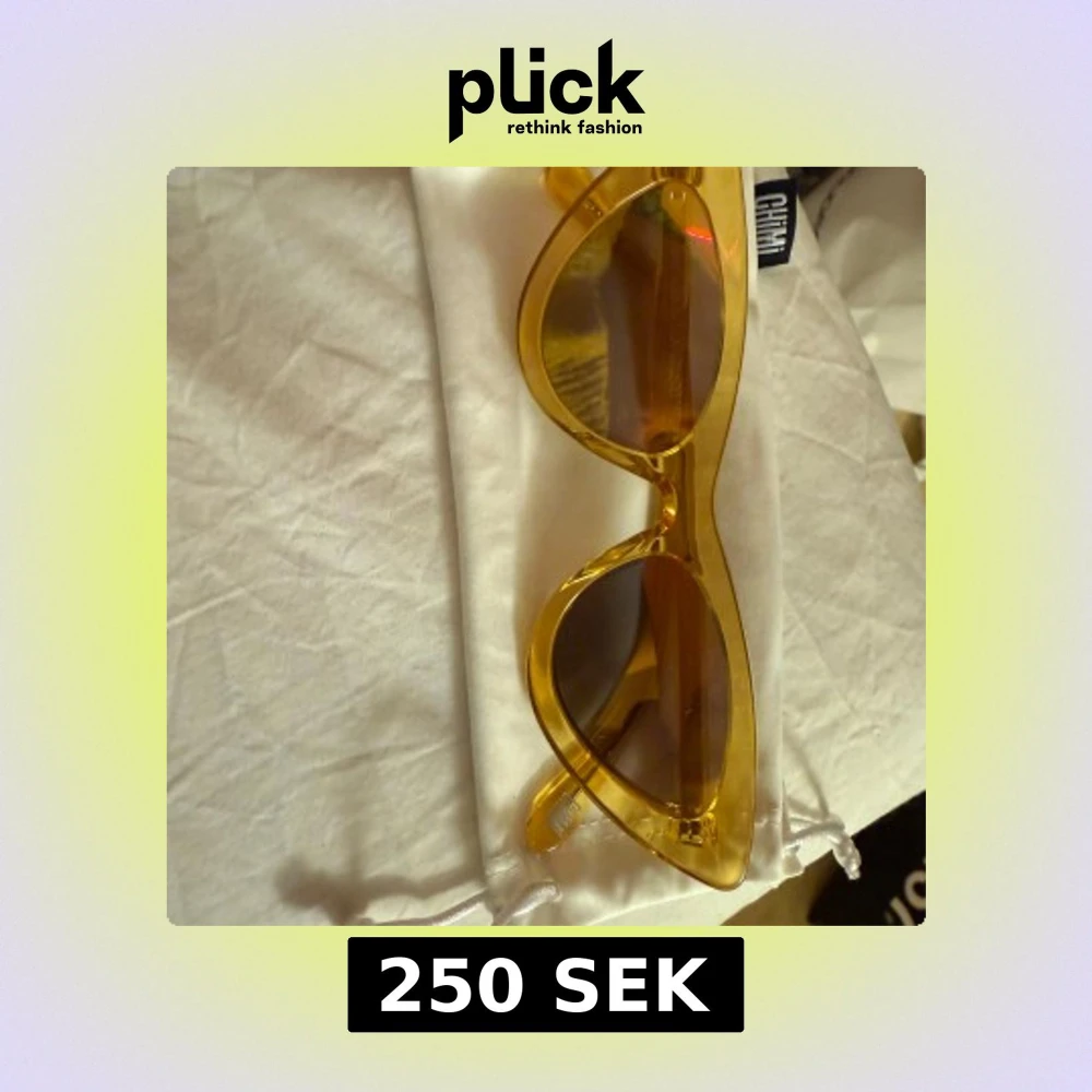 Snygga solglasögon från Chimi i en genomskinlig gul färg med markerad båge och mörka glas. Modellen har en trendig, något kantig form och levereras med originalfodral och putsduk.
