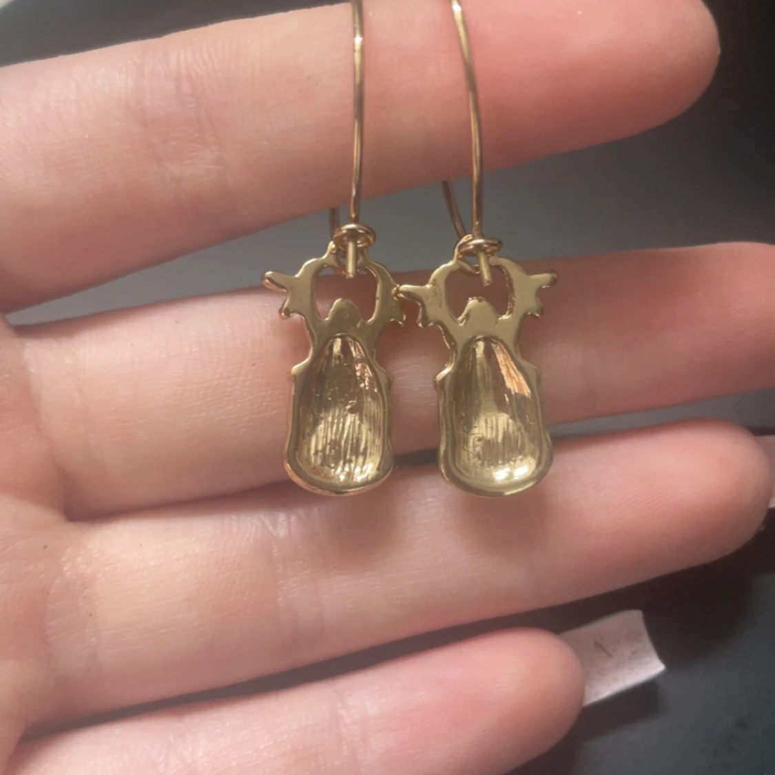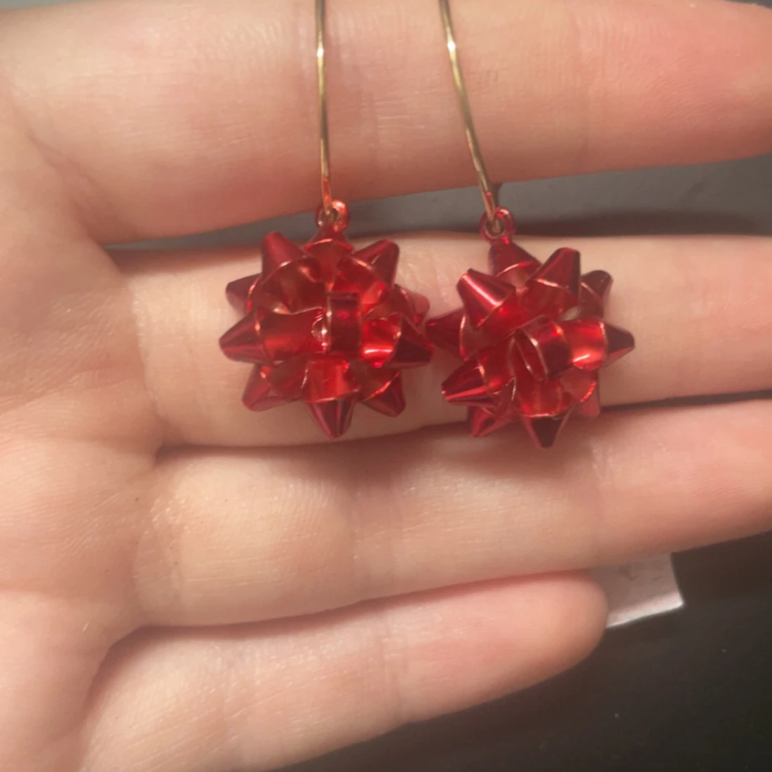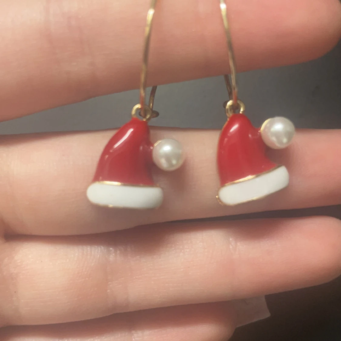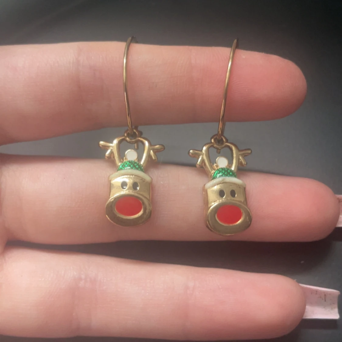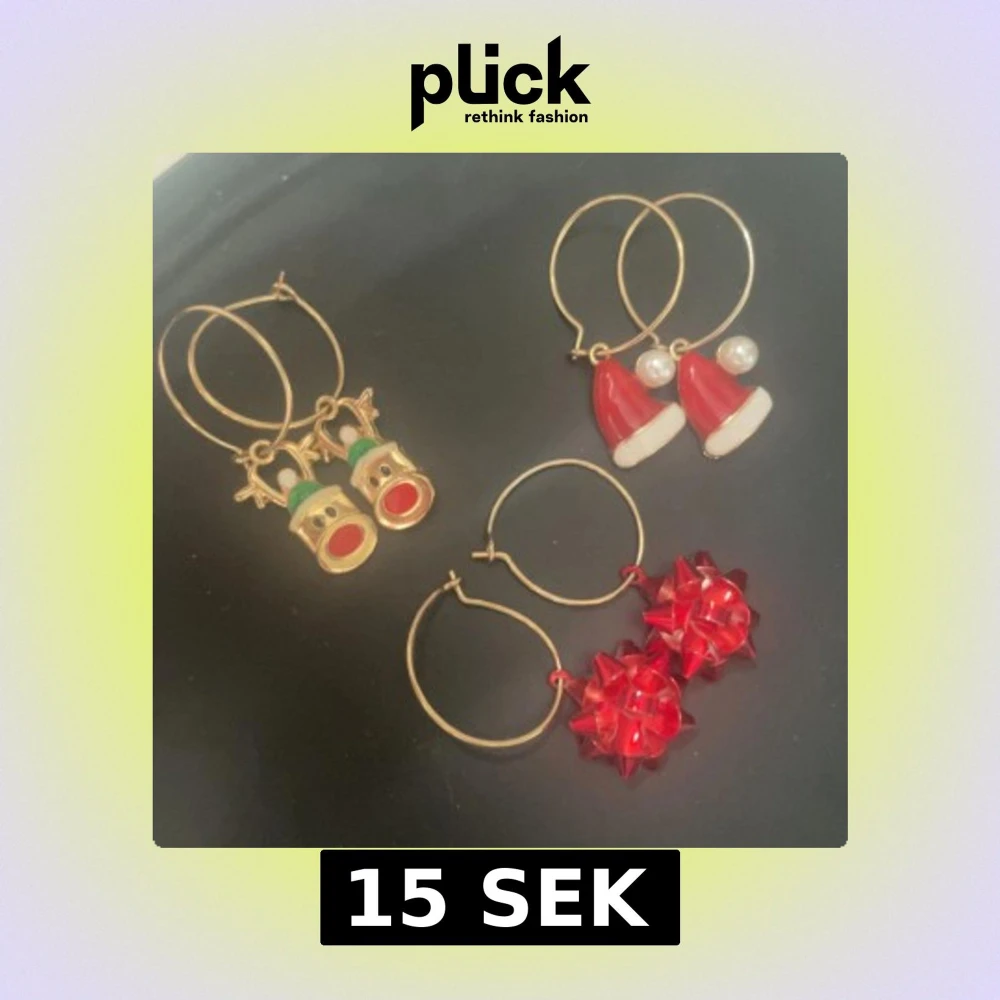 Tre par örhängen med julkänsla: ett par med röda rosett-bows, ett par med tomteluvor och pärldetalj, samt ett par med söta renar i guld, grönt och rött. Perfekta för att maxa julstämningen och sticka ut med roliga detaljer.
