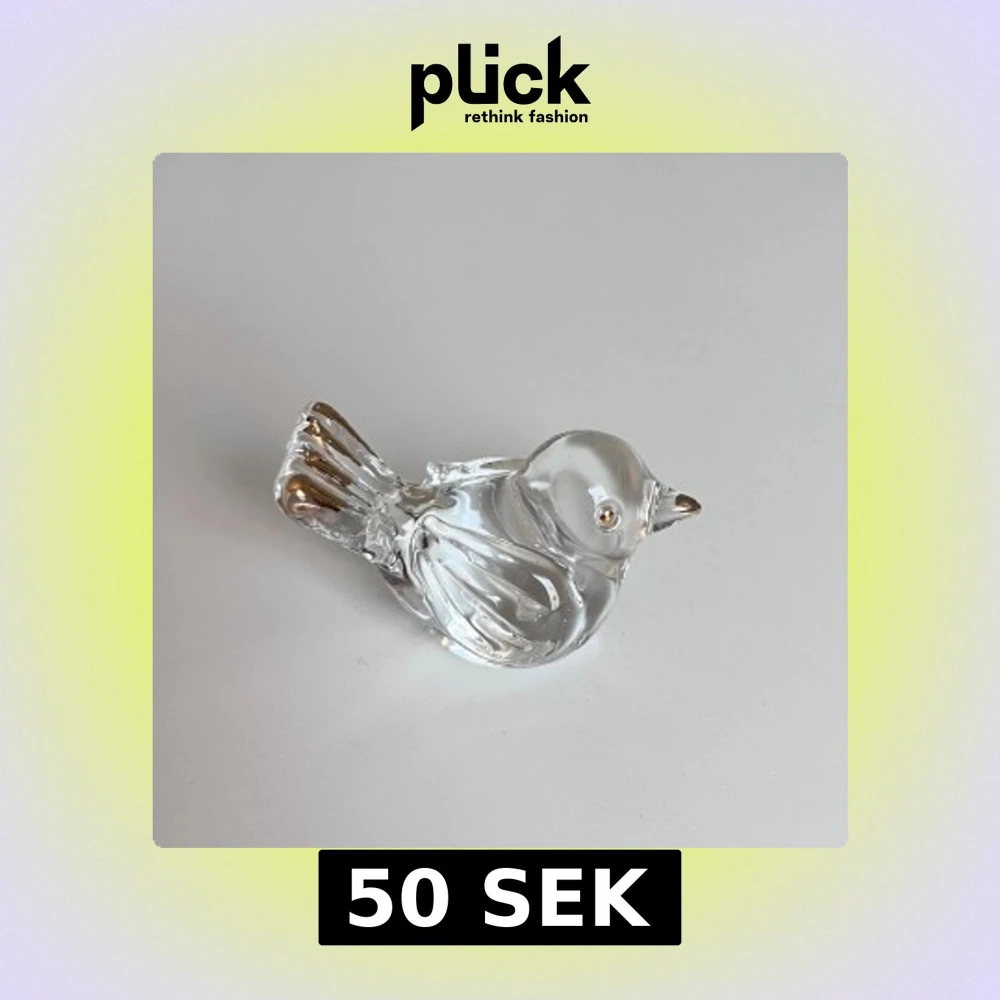 Unik liten fågel i transparent glas med skimrande gulddetaljer på näbb, öga och stjärt. Kommer i en vit presentask med satinliknande tyg. Perfekt accessoar för dig som gillar söta och stilrena smycken. Aldrig använd. Önskar du veta mer? Tveka inte att höra av dig!