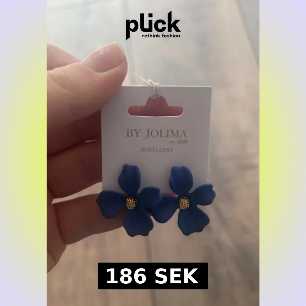 Säljer ett par snygga örhängen från By Jolima i form av blå blommor med guldfärgade detaljer i mitten. De har en cool och modern design som verkligen sticker ut. Perfekta för dig som vill ha något unikt och färgglatt till din look.