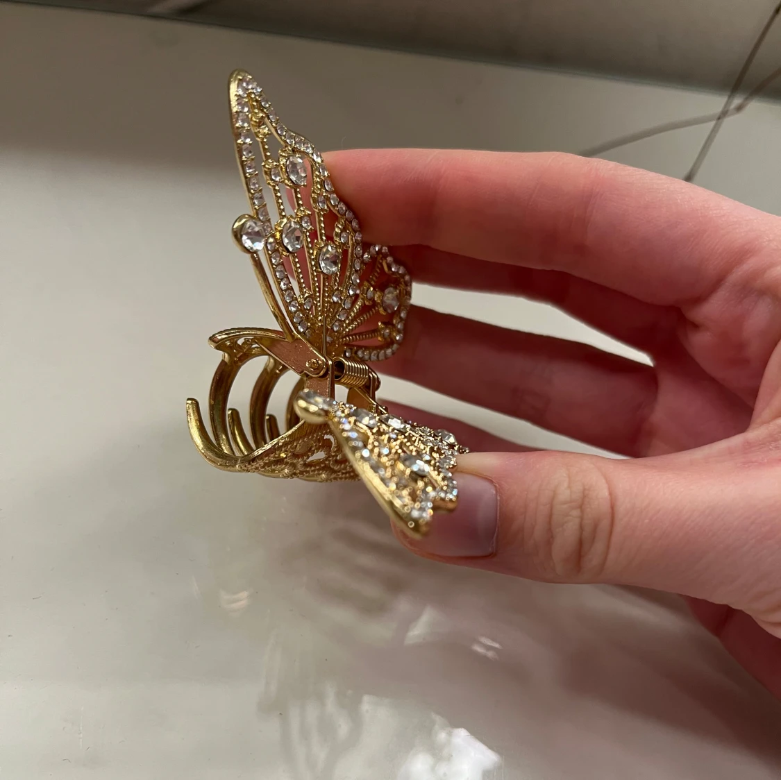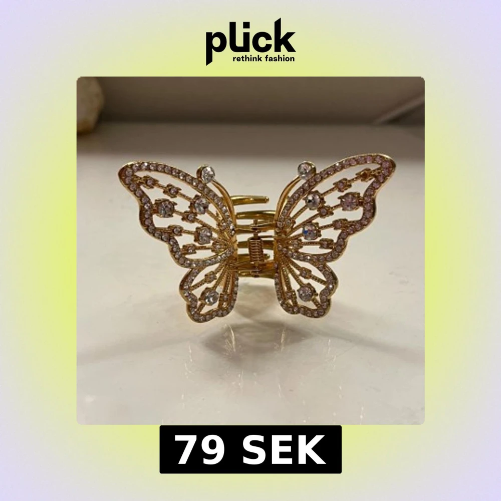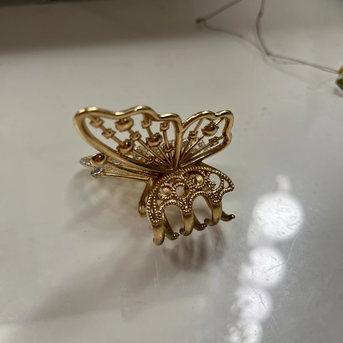 Elegant guldfärgad hårklämma formad som en fjäril, dekorerad med glittrande stenar. Perfekt för att ge en extra touch till din frisyr. Skriv för fler bilder eller funderingar💕