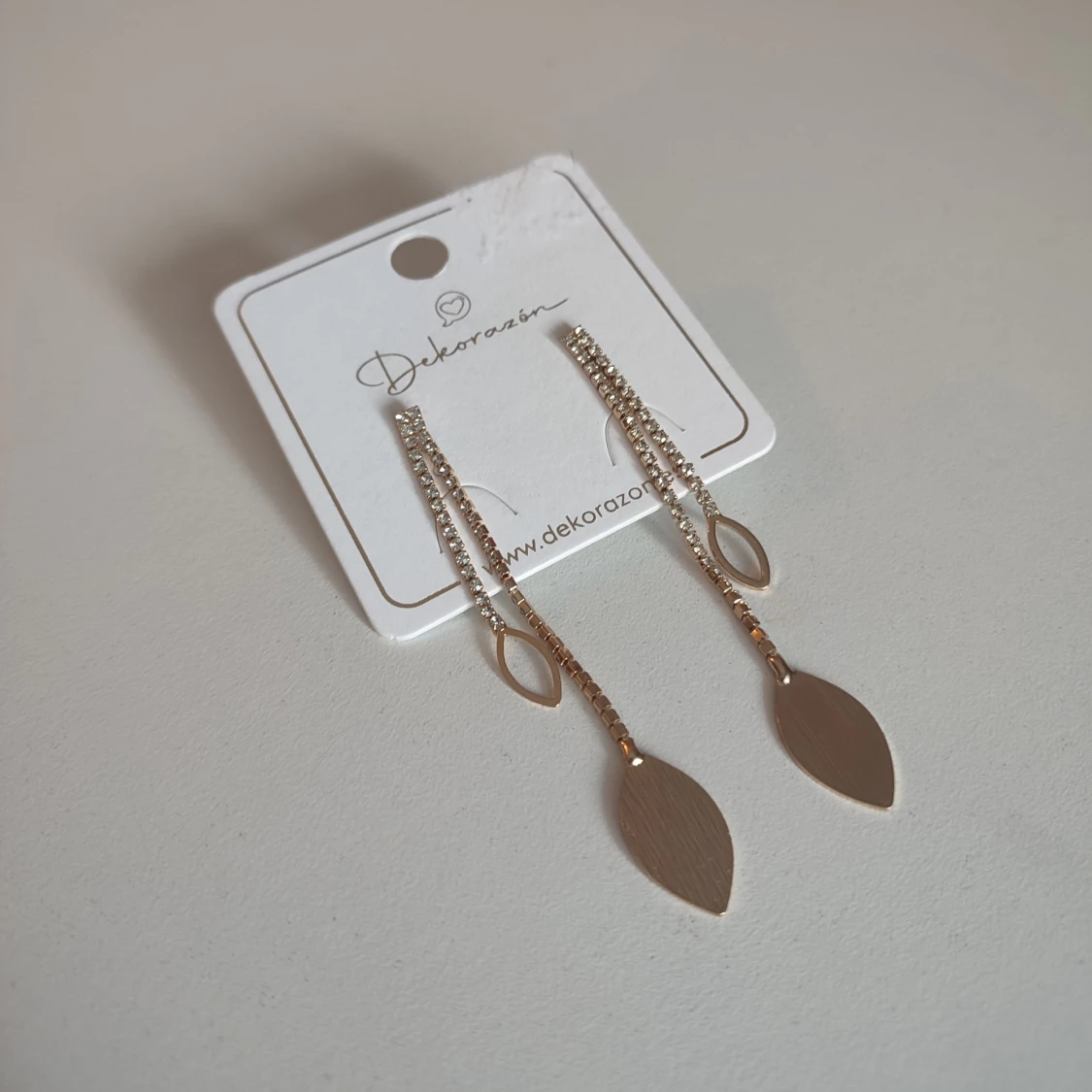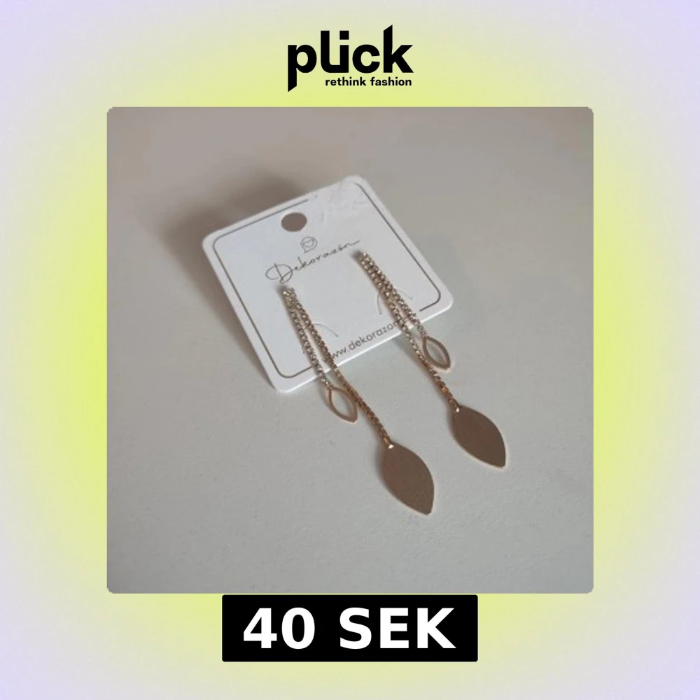 Säljer ett par oanvända eleganta guldiga örhängen från Dekorazia, köpta i Spanien. Örhängena har två kedjor med glasdiamanter och små bladformade hängen i guld, vilket ger en stilren och trendig look. Perfekta för att lyfta din outfit!