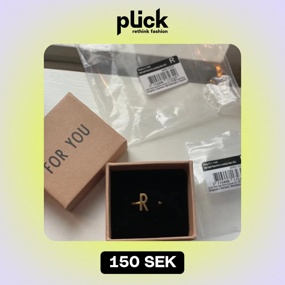 Helt oanvänd ring formad som bokstaven R från märket Design Letters. ONESIZE - i och med att den är öppen kan man justera själv! 18K pläterad Nypris: 569kr