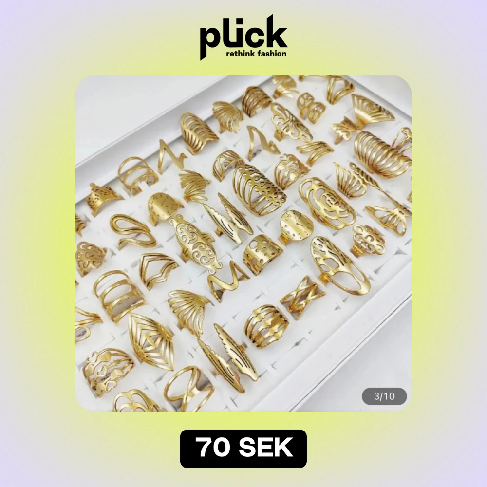 Ett fantastiskt set med guldiga ringar i olika unika och trendiga designer. Perfekt för att mixa och matcha till olika outfits. Ringarna har olika former och mönster, vilket gör dem till ett mångsidigt tillskott i smyckesamlingen. Perfekt för både vardag och fest! (Dem är för stora för mig. Jag har smala fingrar. Bara några som passade)