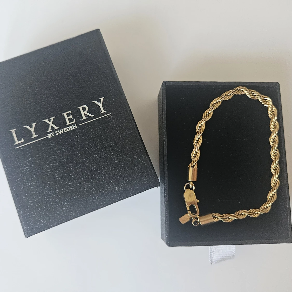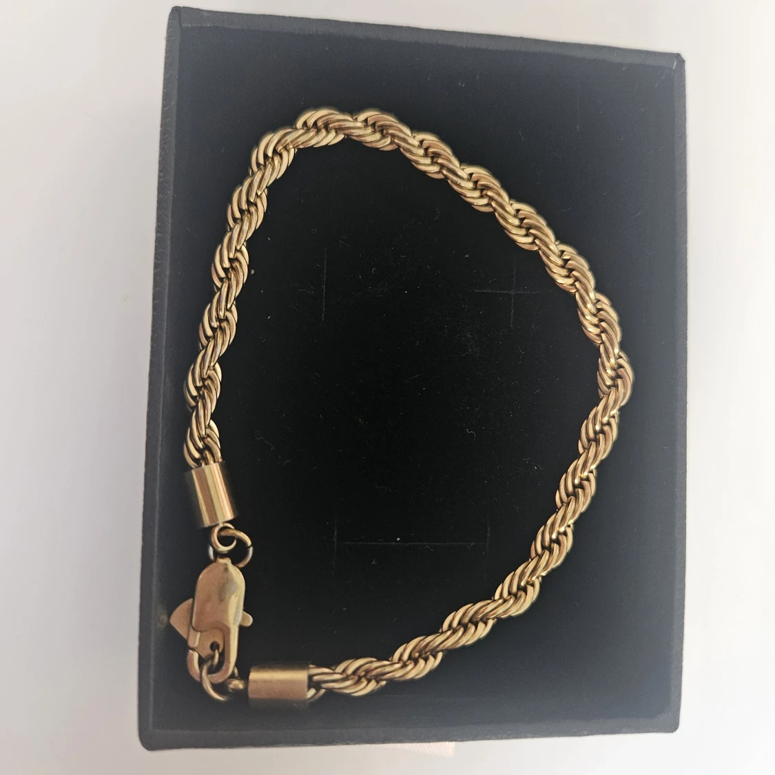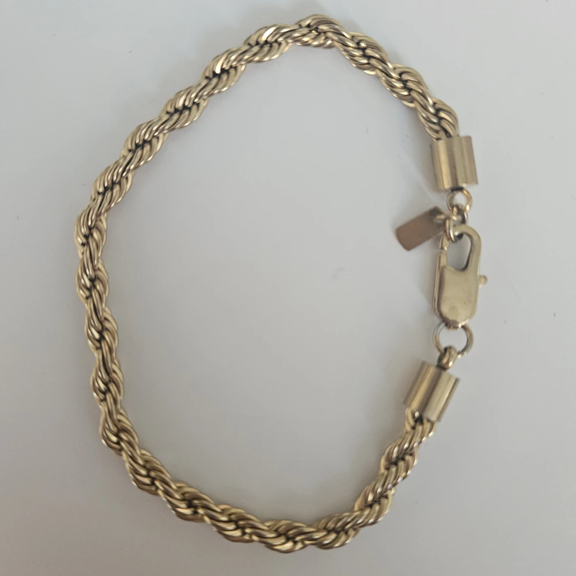 Kirurgiskt stål som är guldpläterad. 399 kr hos Lyxery. Endast testad men passade inte. Kedjan är 19 cm lång