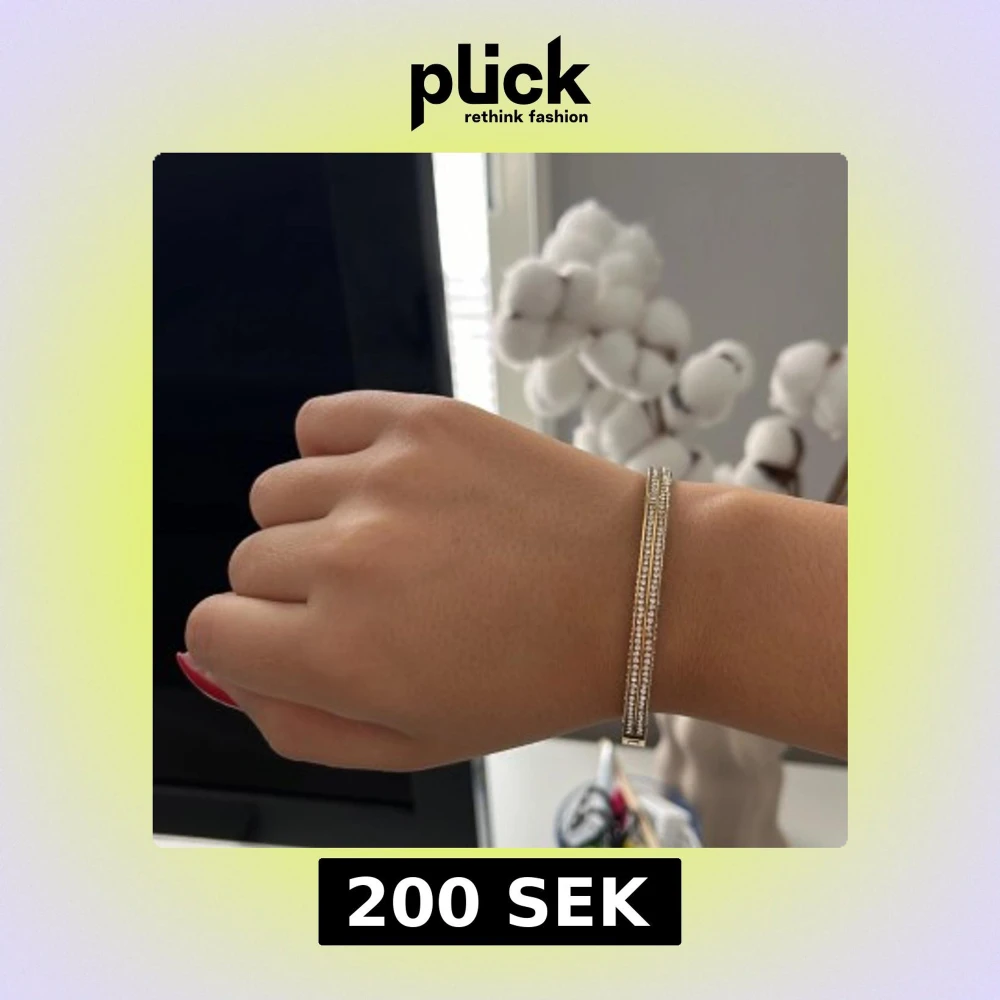 Elegant guldarmband med glittriga detaljer. Armbandet har en stilren design med små gnistrande stenar längs kanterna, perfekt för att ge en touch av glamour till din outfit.