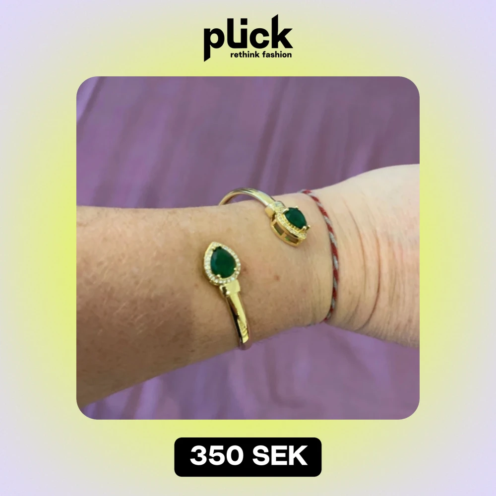 Snyggt guldarmband med två droppformade gröna stenar i ändarna. Armbandet har en öppen design och är perfekt för att ge en elegant touch till vilken outfit som helst. De gröna stenarna är omgivna av små, glittrande detaljer som ger extra bling. Perfekt för festliga tillfällen eller som en fin present!